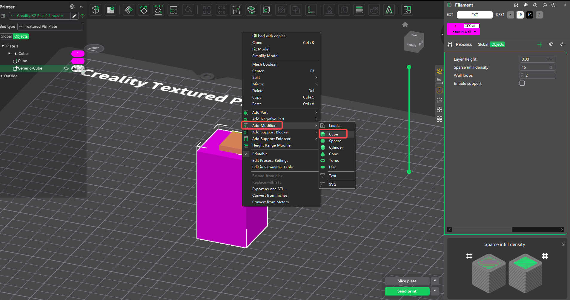 I would like to have part of my model print at 100% infill but I cannot find a tutorial or any literatrue on how to do it with Creality Print. I can only see some tutes and questions from people using Cura. I used to use Cura, but I have only just started with Creality Print since I purchased my K1C.