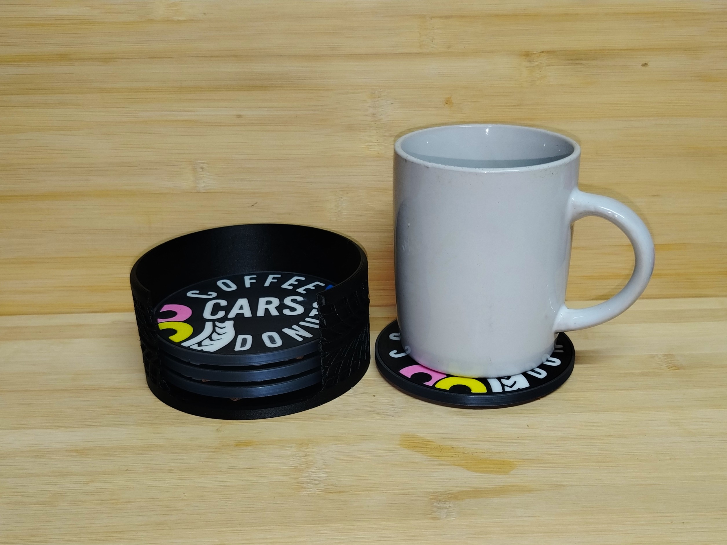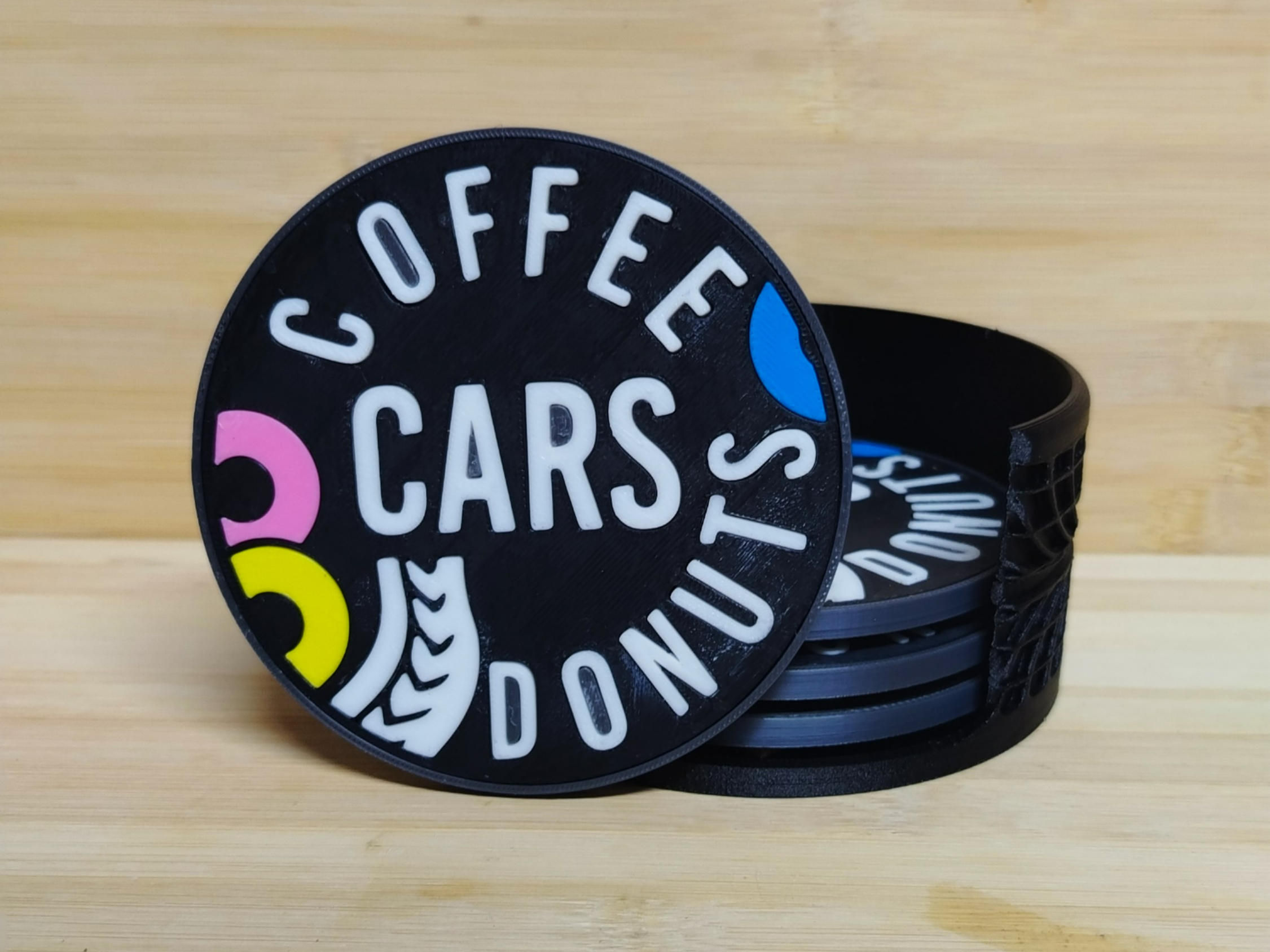 This bold, playful coaster brings together three of life’s greatest joys—coffee, cars, and donuts—into one eye-catching design. 3D printed with crisp raised lettering and vibrant accent colors, it’s perfect for adding personality to your desk, garage, or coffee station.