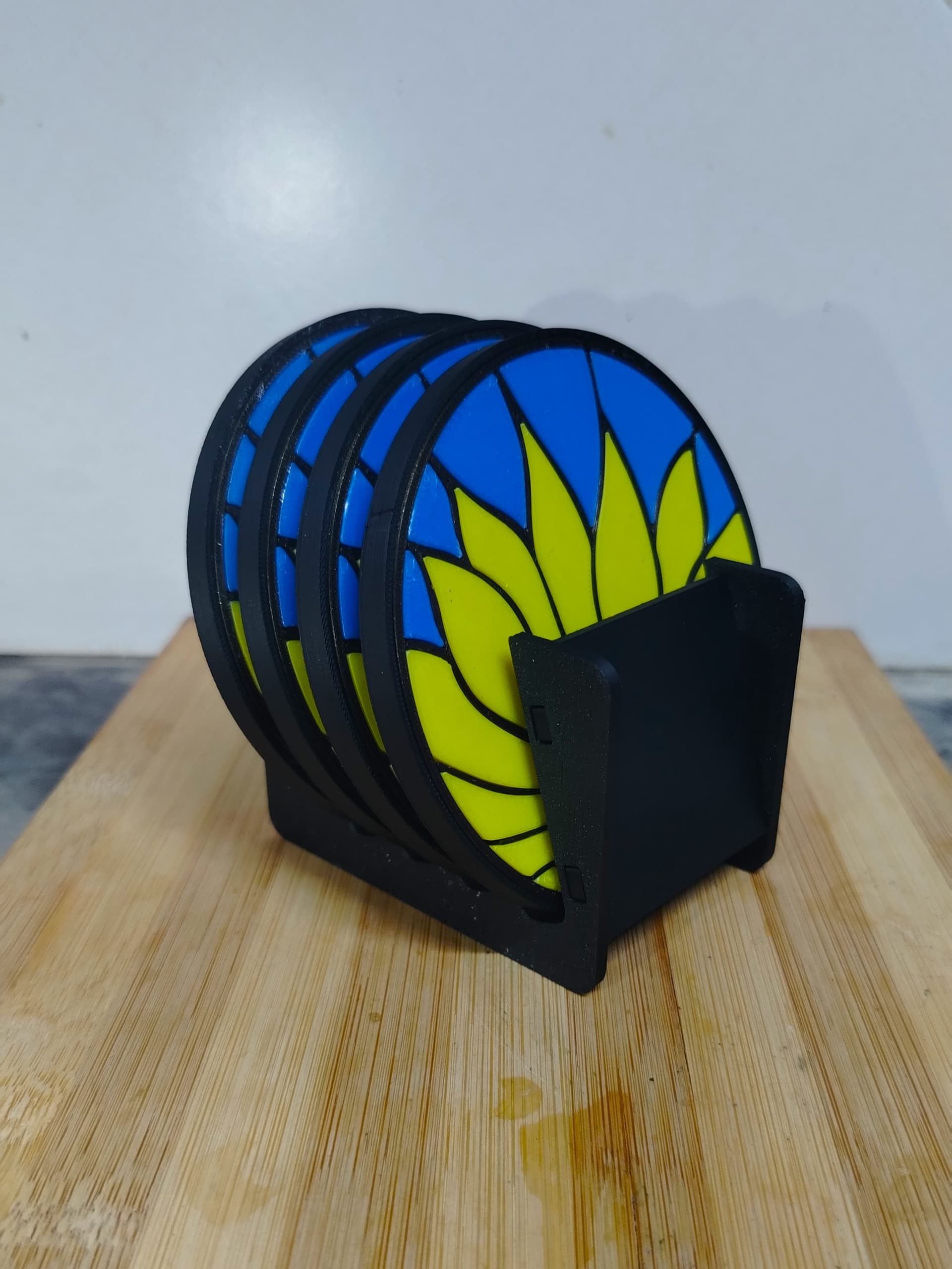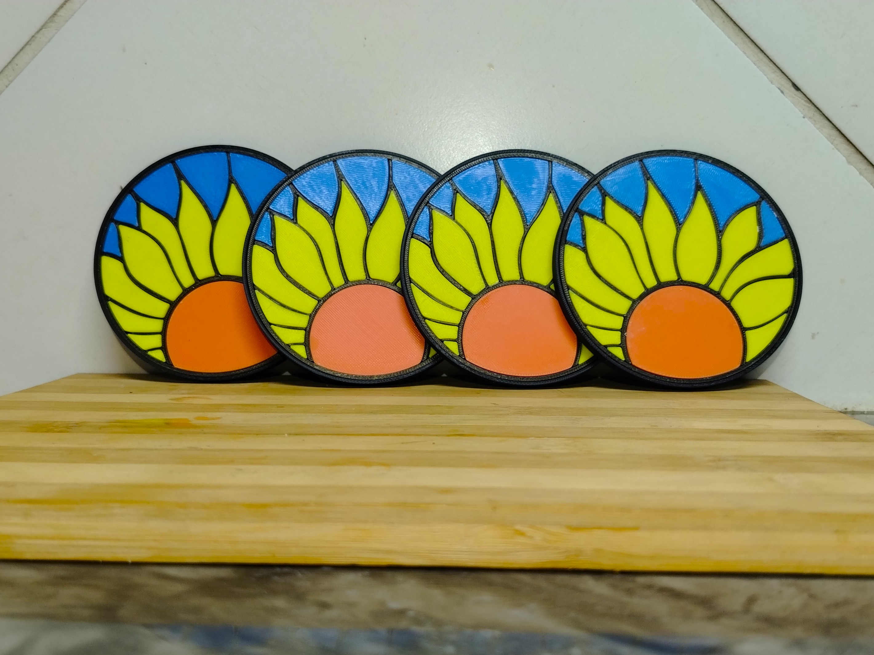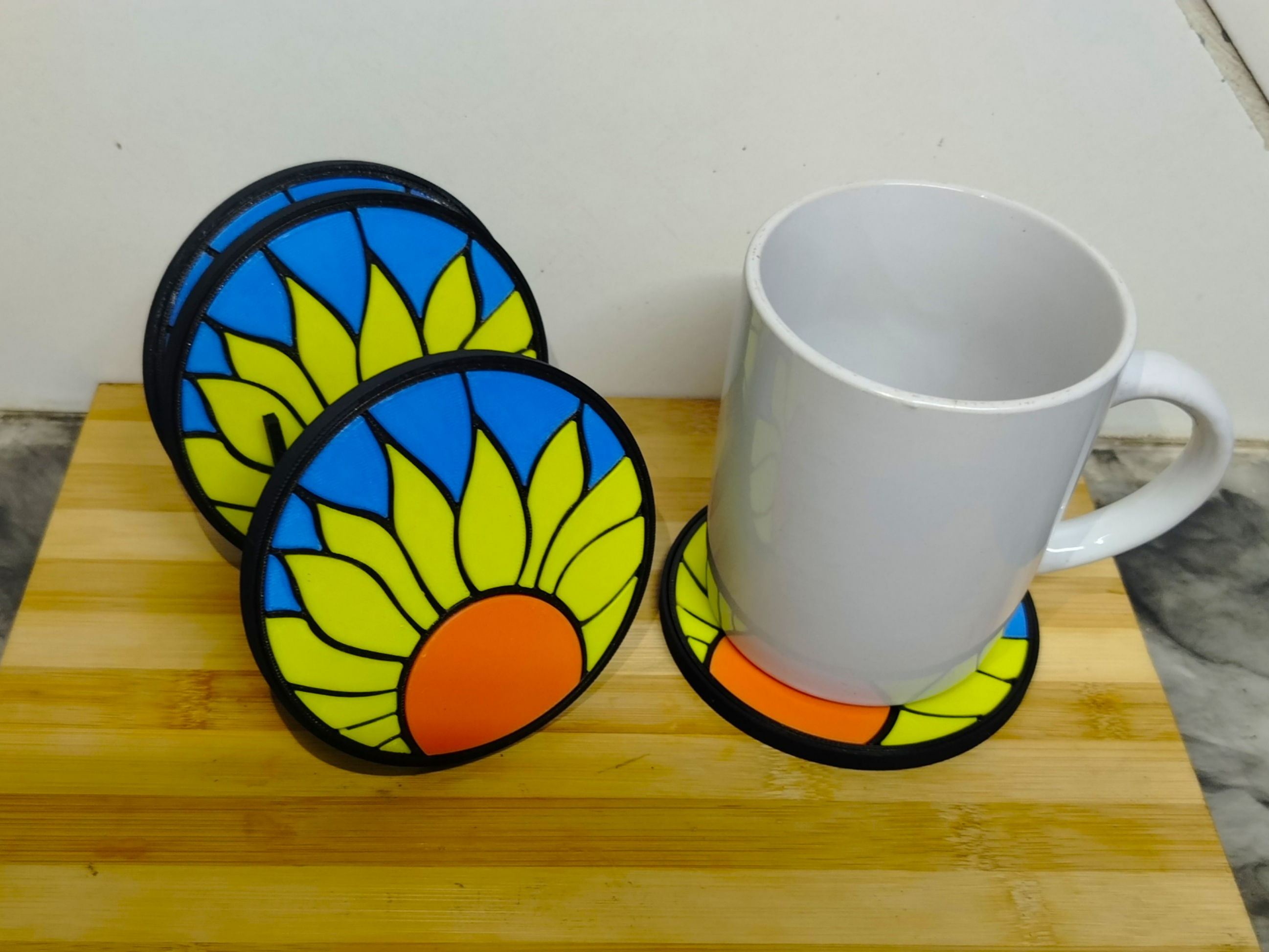 Designed to bring a splash of sunshine to your space, each coaster features bold sunflower petals bursting with vibrant yellow, sky blue, and a warm orange center. ![]()