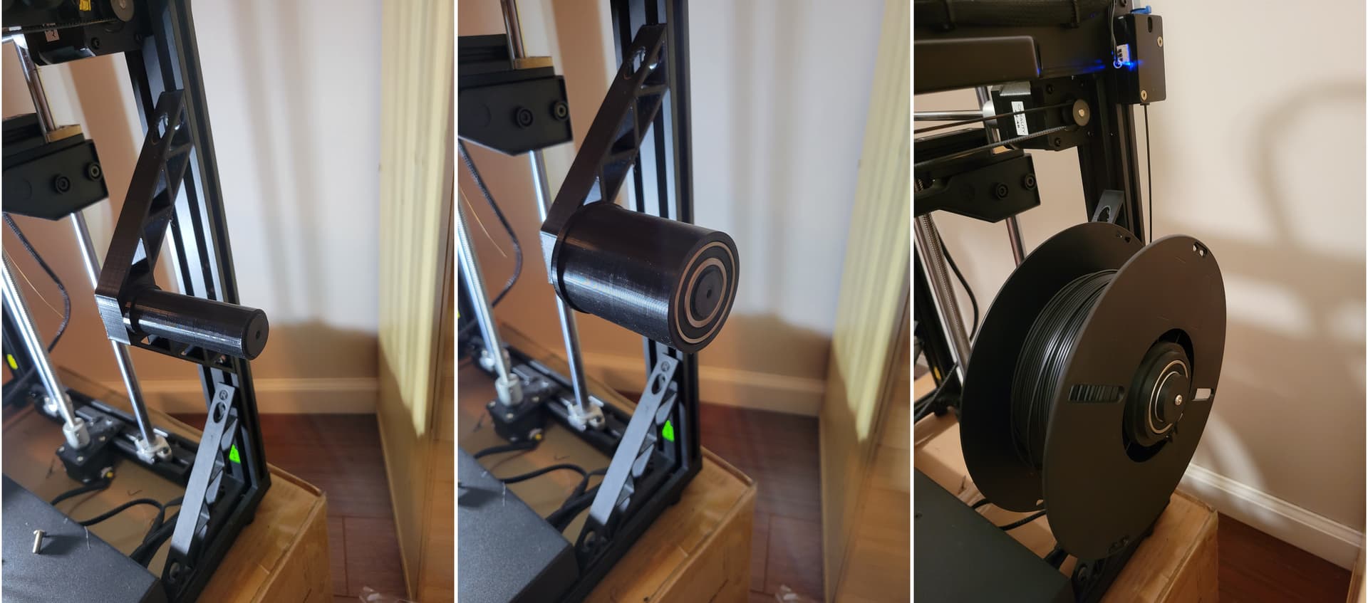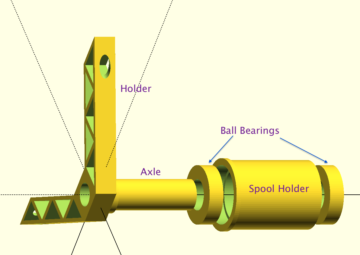I have improved the design of the spool holder for the Ender S5 a bit. The factory holder is just a plastic axle on which the spool rotates. The problem is, there is friction between that plastic and the spool, especially if the spool is still full and heavy. Then, instead of smoothly rotating, the spool can be pulled up ever so slightly by the filament, and only when the force overcomes the friction, it rotates. This sends shock waves along the filament, which then causes small blemishes in the print. This can be seen especially on smooth surfaces.