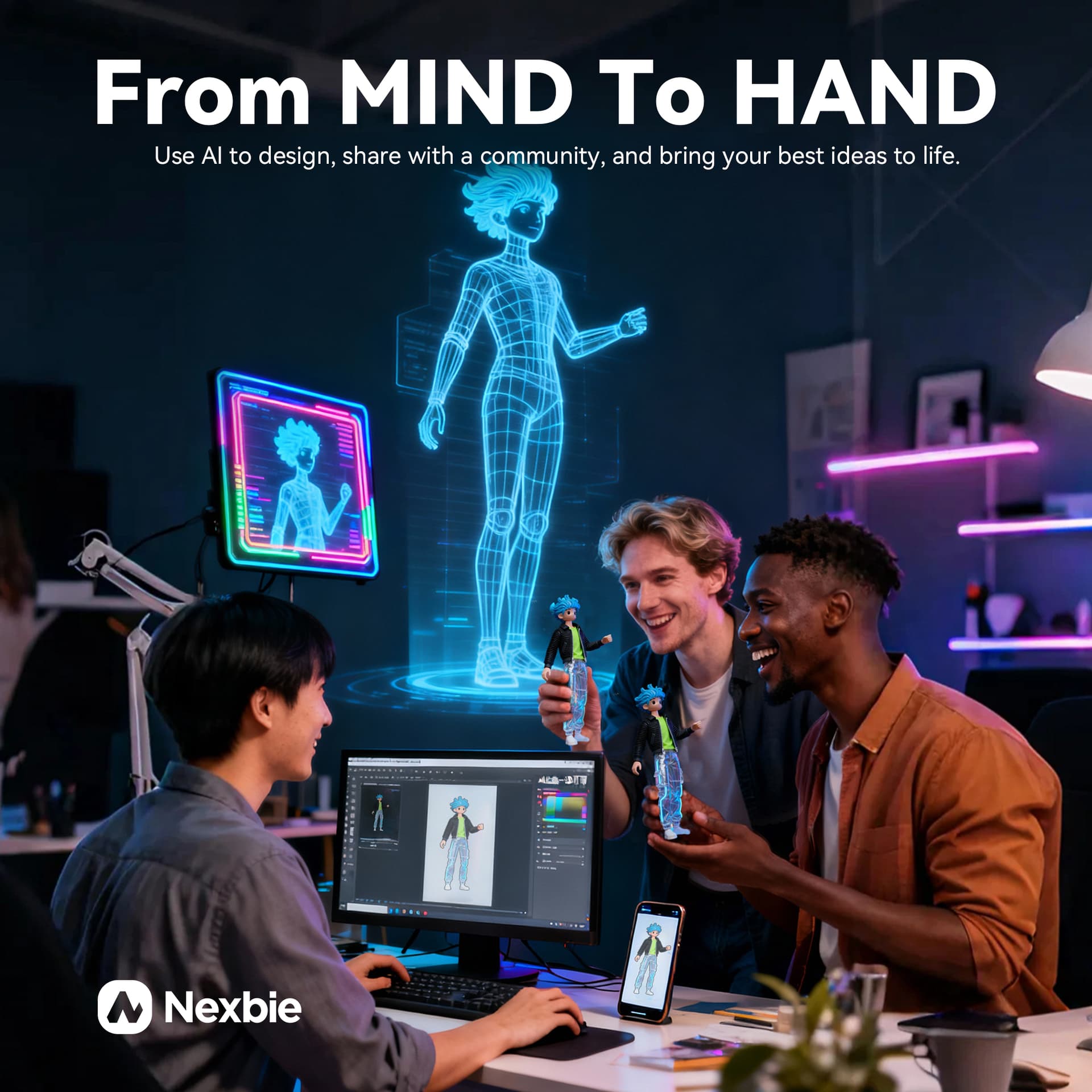 With Nexbie, use powerful AI tools to design unique items, share them with a vibrant community, compete for cash prizes in our “Arcade.” Through our ‘Nex’ feature, your most popular designs can be turned into physical ones you and your supporters can own.