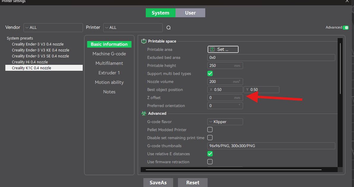 If you want to change it on your K1 directly (so it works everytime on any platform), you have to root it, access the printer.cfg file and modify there