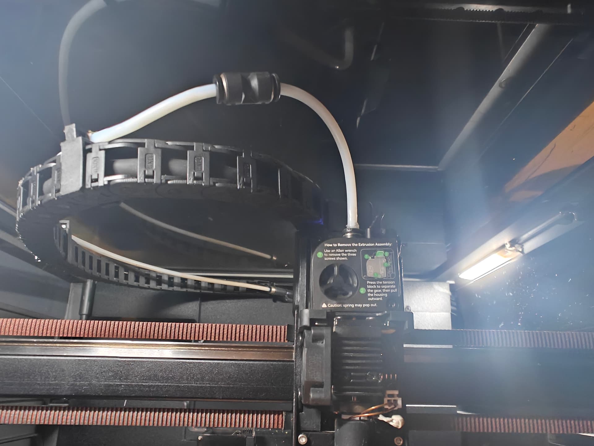 Have used the connector from the reserve parts so i can disconnect the ptfe tube near the extruder (that also is my fix for the connector with the little theet have broken on top of my extruder that hold the ptfe tube in, used some super glue to to hold it in the extruder). And placed 2 washers by the spring in the 4 way hub, needed 2 washer because i have had shorten the spring and that did not work.