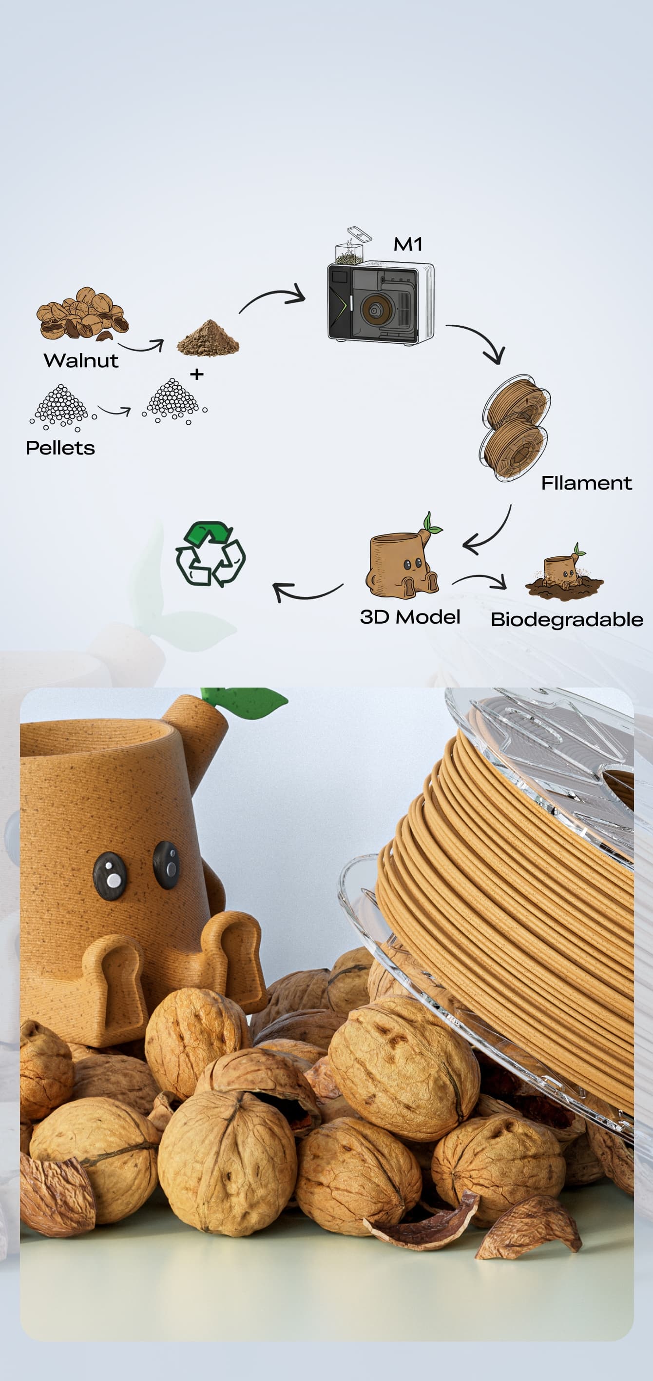 The M1 & R1 form the first desktop system that does two things: recycle your waste plastic back into usable filament, and let you create your own custom filament from scratch β Waste In. Filament Out. Defined by You.
