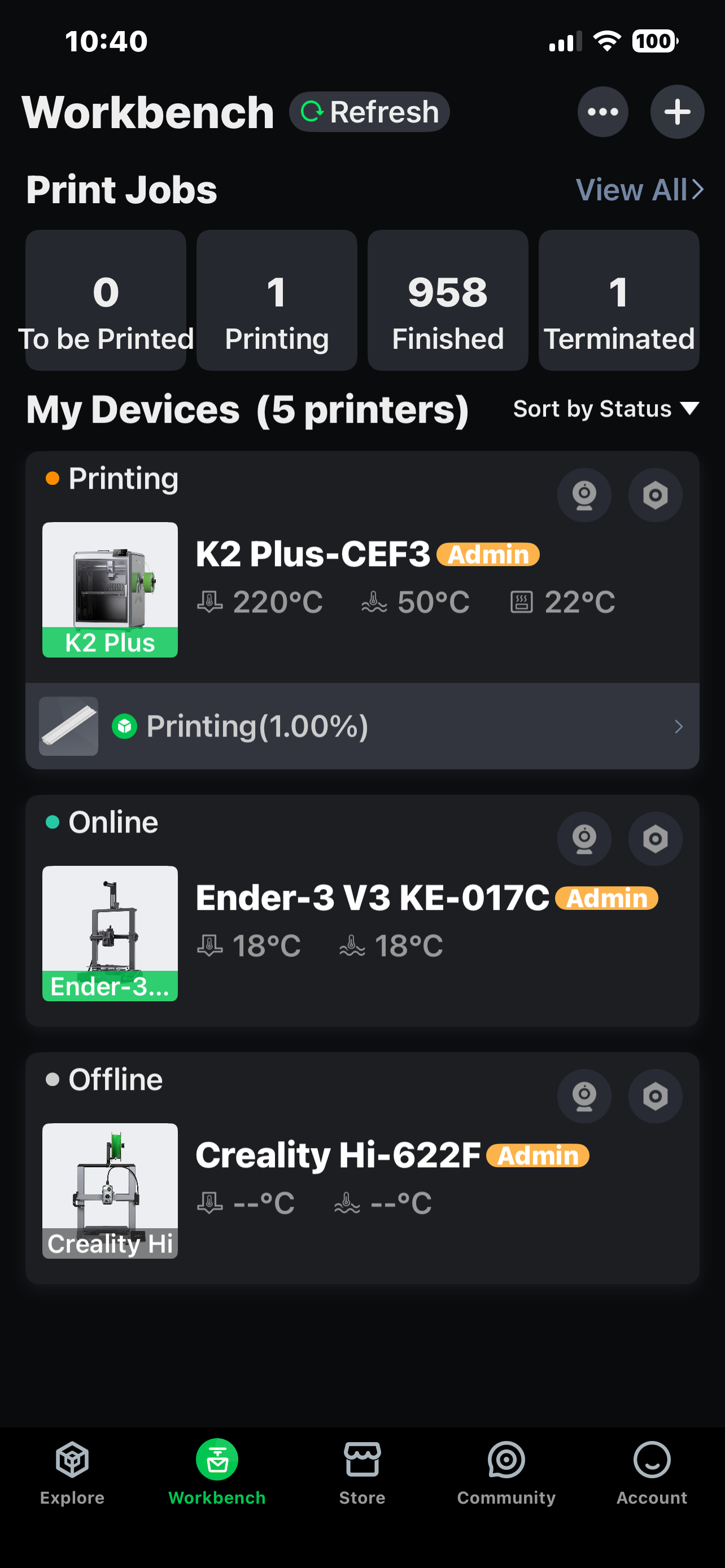 I haven’t used this in a while but worked last time. Has an x-number of printers connected directly via wifi and 2 sonic pads with printers connected. These 2 sonic pads do not appear in either the app or under the workbench on creality’s page. In the app when I start them it shows that I have more printers but nothing more.