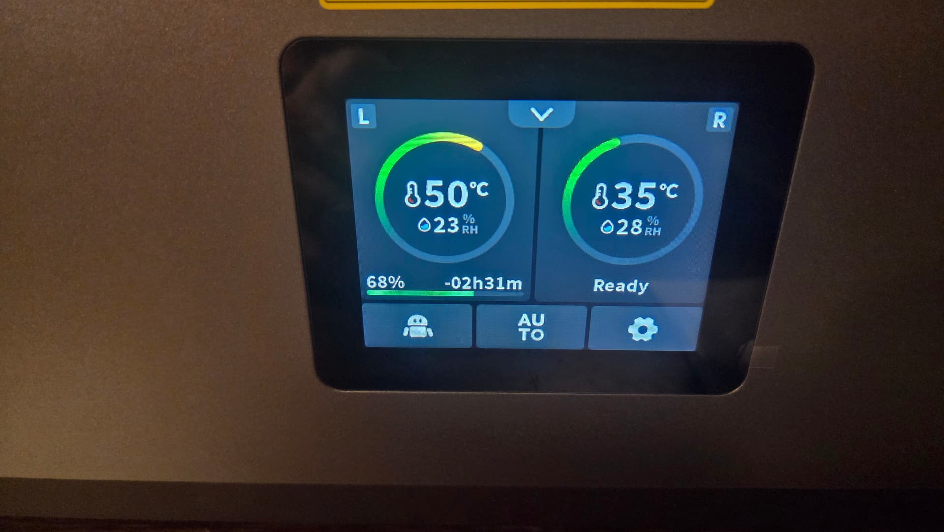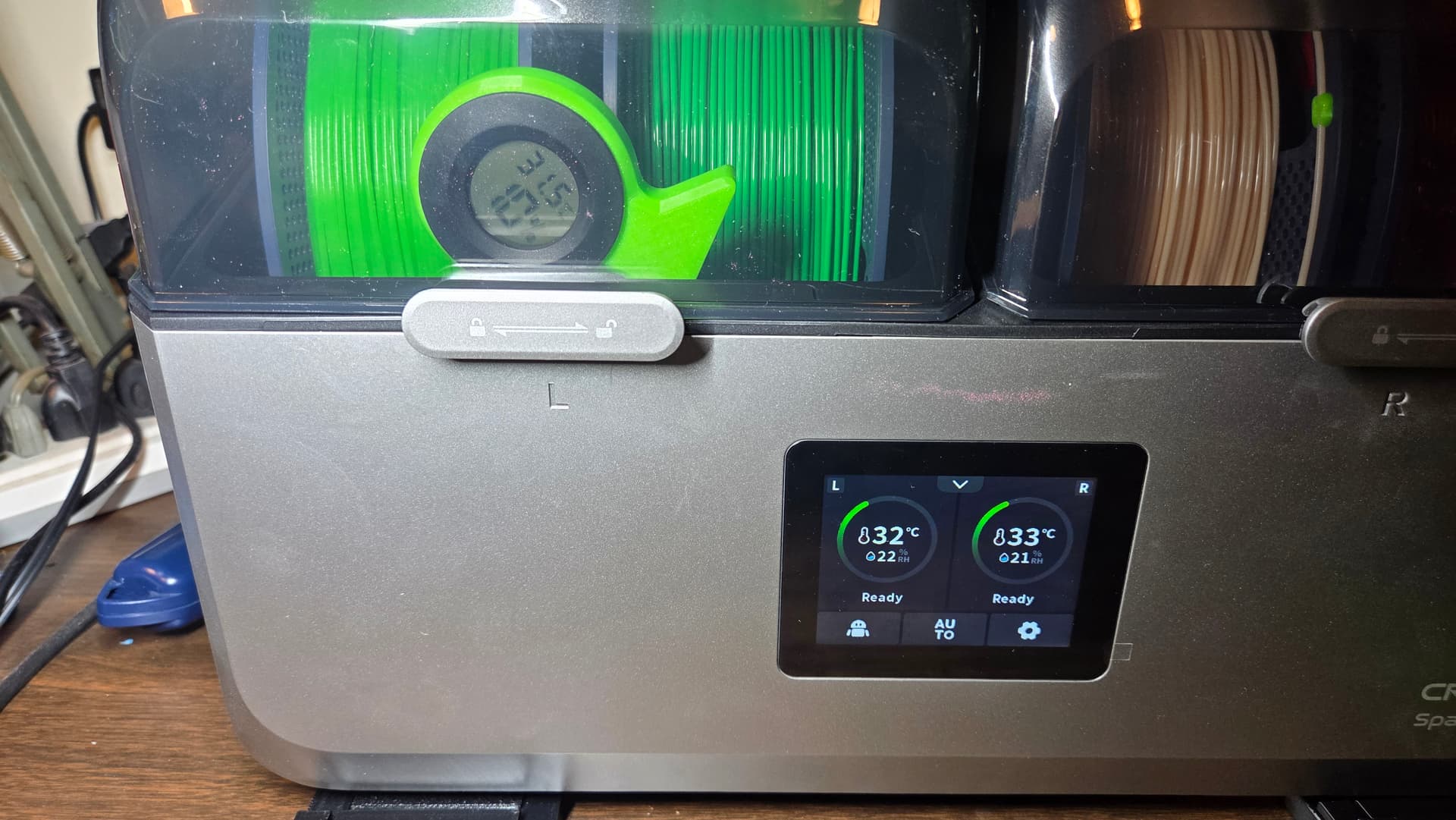 In use, the SpacePi is quite simple to operate. There are options that can be set independantly for each bay (each bay can hold 2x1Kg rolls of filament or 1x2Kg roll.