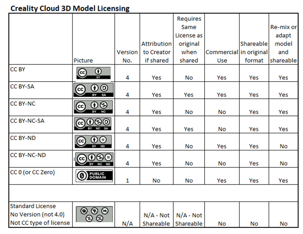 This discussion is specific to Creality Cloud 3D model licensing but will help on other sites that use Creative Common (CC) licenses or a Standard License, but not other license types.
