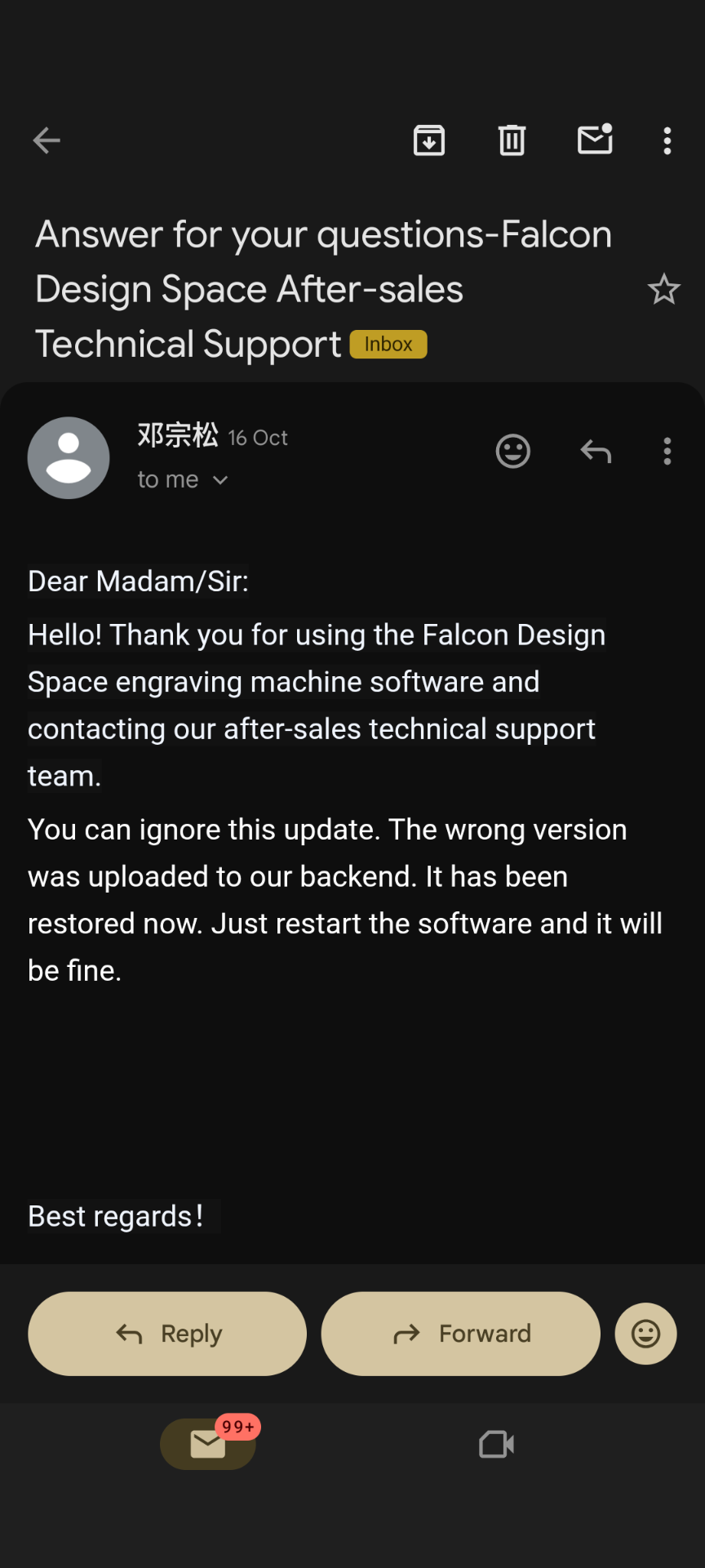 Wow .. How did you get a response from support? I have tried all week to get support to fix a problem registering my Falcon A1. No response. Did you phone China!!