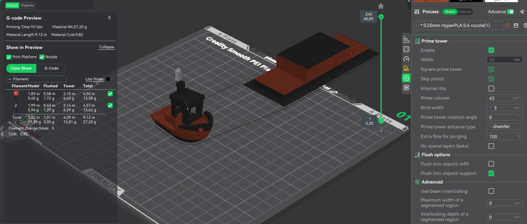 Yet, when I think about it, my first-first print when I got the printer was benchy from that USB I got with the printer. Now that I think about it, that print lasted about 18 minutes - now it says that for a single color benchy is approx 45 minutes. It makes me wonder, how fast is that first one being printed?