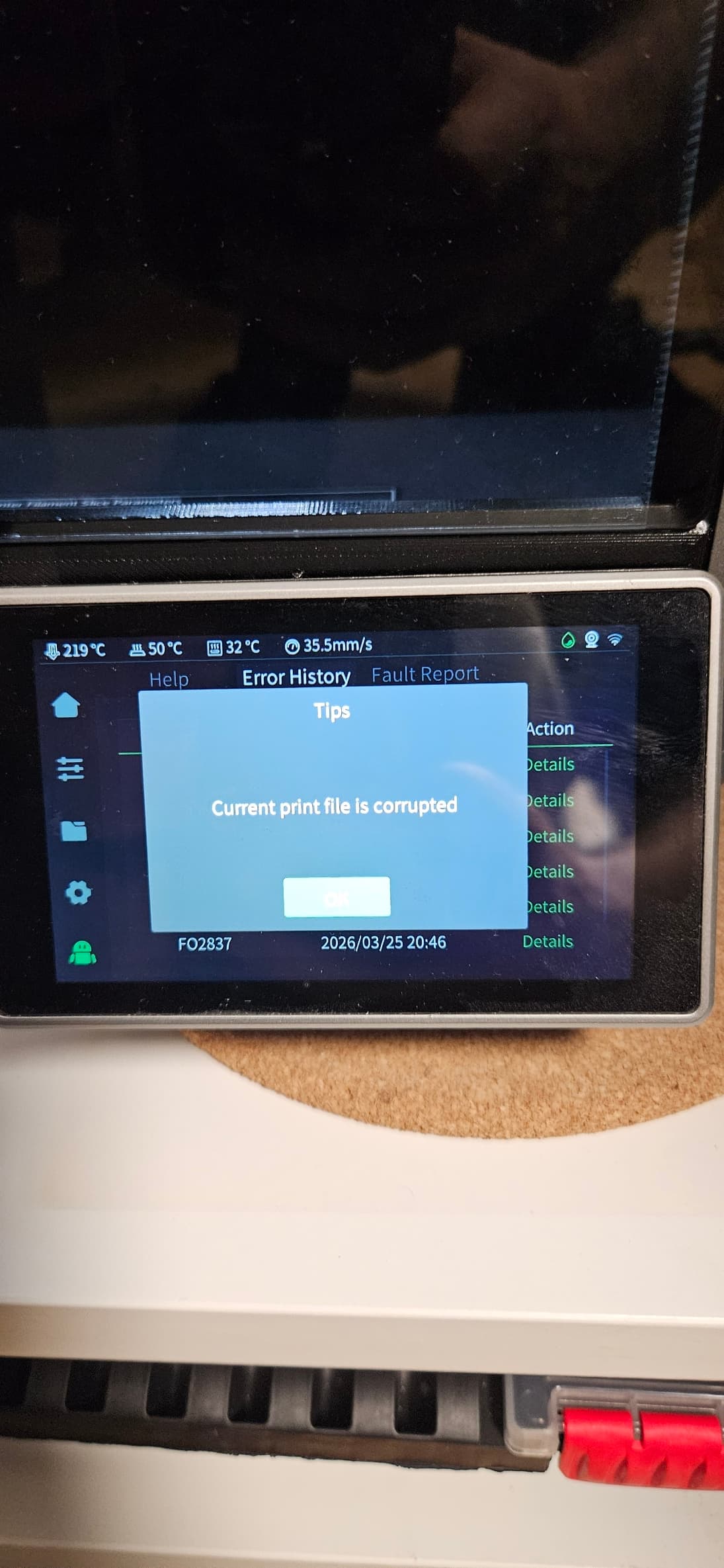 I restarted the print, and after it’s startup procedure, the print finally started, and went alright up until the first color change (about 12 minutes in), when the print stopped, resulting an “Print file corrupt” error.