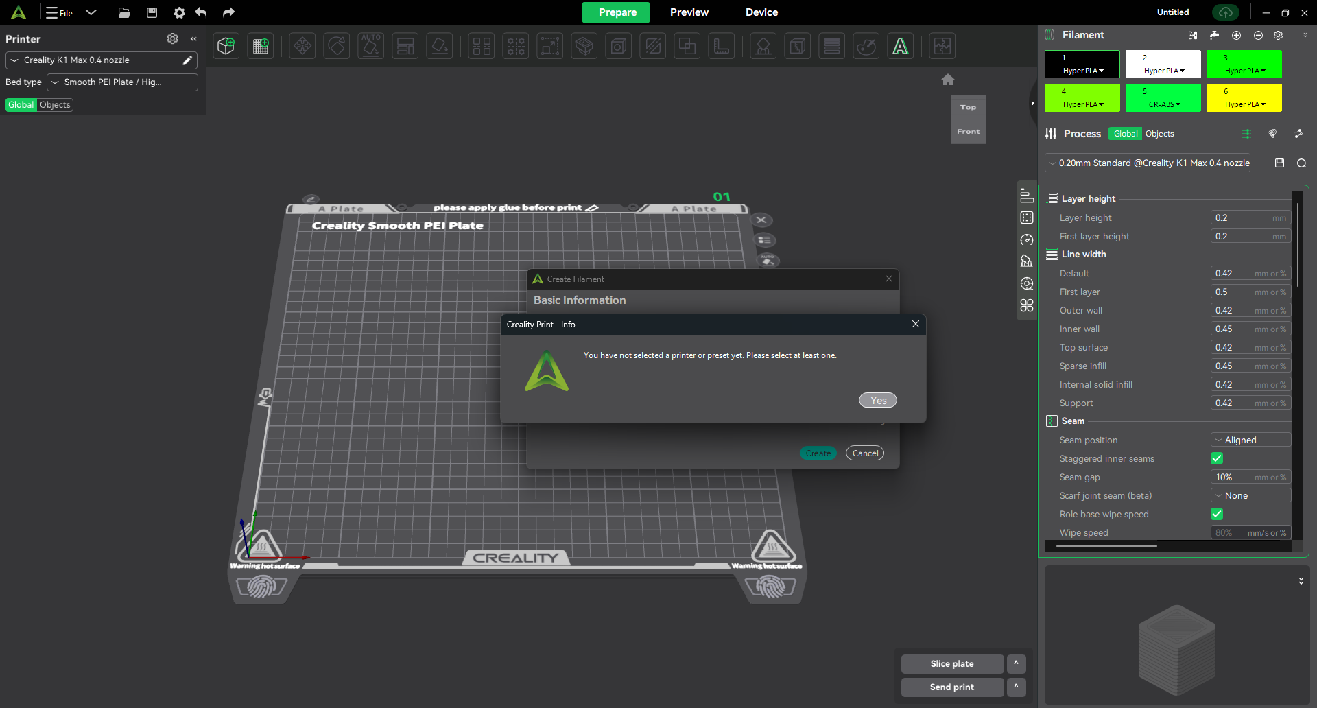 And here we can see that it is not possible to create a custom filament. The material is present at the list but there is no base profile, even a generic one, in the K1 Max machine profile to be the template.
