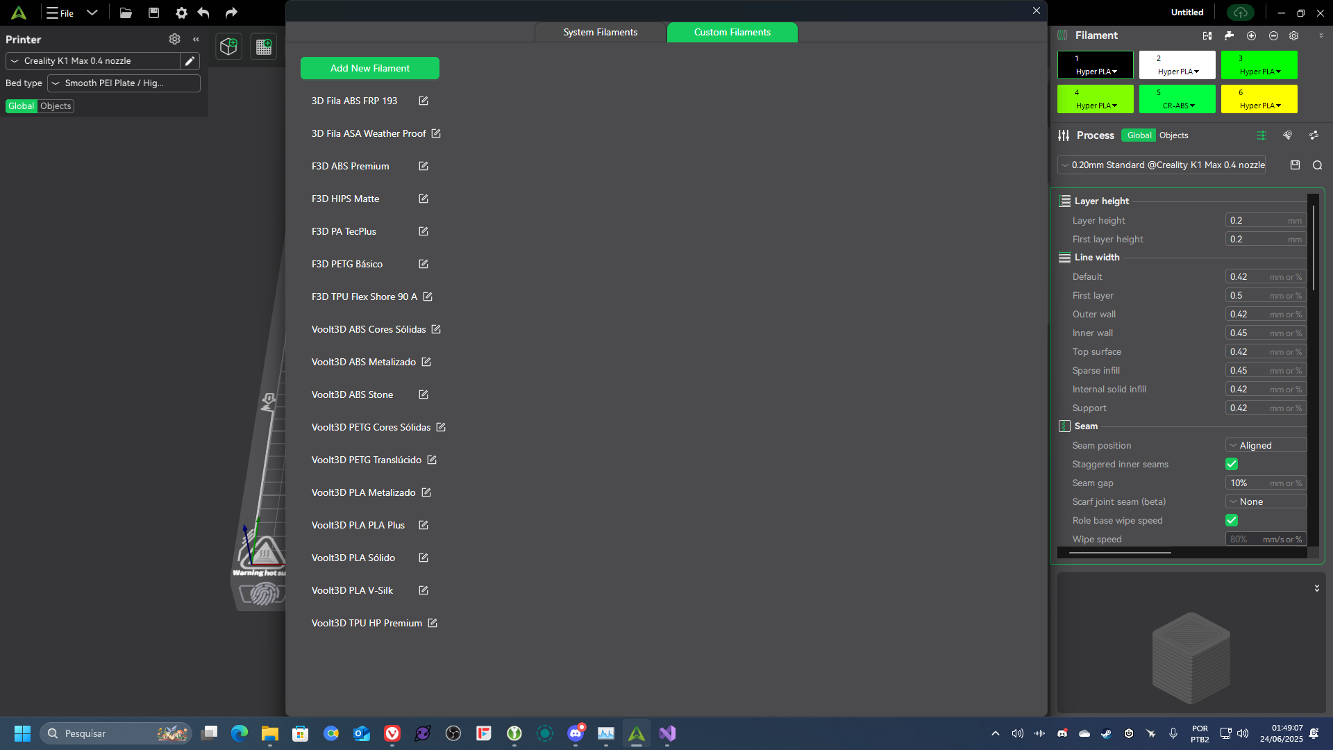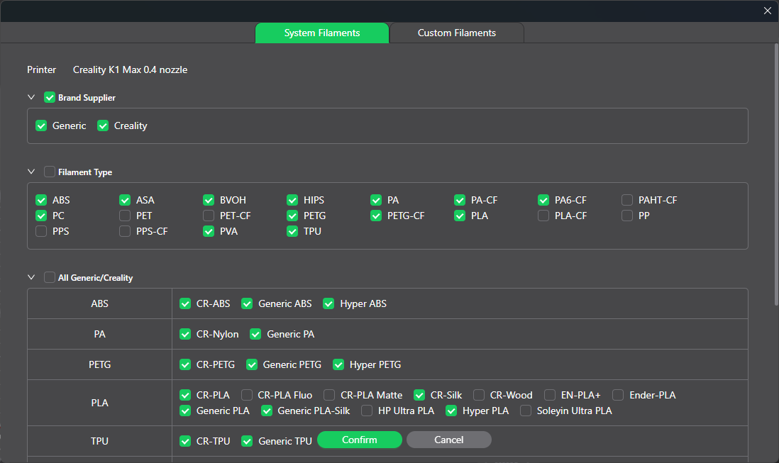 In the image above, we can see that there is no PCTG or PCT-G available to be selected. In the K2 Plus machine profile there is a PCTG material profile but I can’t copy it from the K2 Plus profile into the K1 Max profile. I even tried to export it but there is no way to unbind it from the K2 Plus and bind it to the K1 Max.