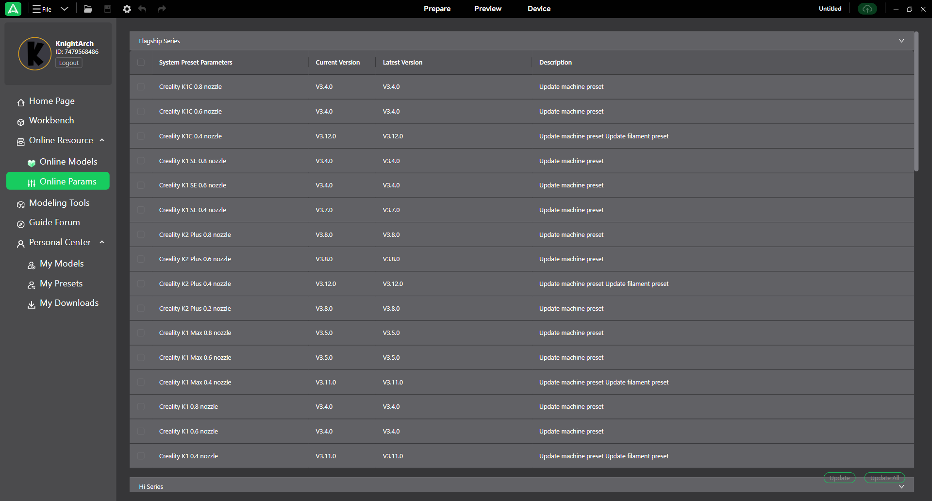 May I suggest a Creality Cloud related services tab under the Personal Center, or just another option under the Online Resources in the Home tab, right above the “Online Params”?