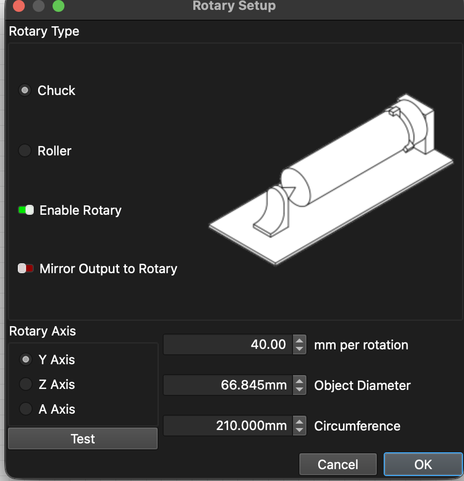 Creality Rotary Kit Pro Help Needed! Today I tried to get this running. I followed the instructions provided but I still cant get it running right. Example: I measured a stainless steel water bottle (coated) and it was 236mm circumference. I added that information in Lightburn in the Rotary Setup box. Creality says to check “Chuck”, enable rotary and add 40 to the mm per rotation. The only thing I didnt do was check the Rotary Axis because as you can see from my pic I dont have that option. When I try to engrave a rectangle 236mm High and about 5mm wide it begins to engrave but the rotary tool just keeps turning. Turns about 5 full rotations before stoping and coming back. I have changed the mm per rotation from as low as 5 to as high as 1000 and it just does the same thing. I have tried EVERYTHING! Anyone have any ideas? Thank you.