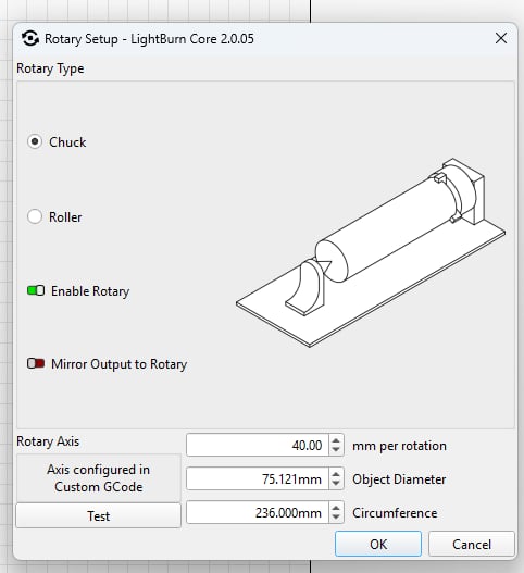 I’d say your setup looks correct for the most part, but i’m questioning something about the rotary config window in lightburn.