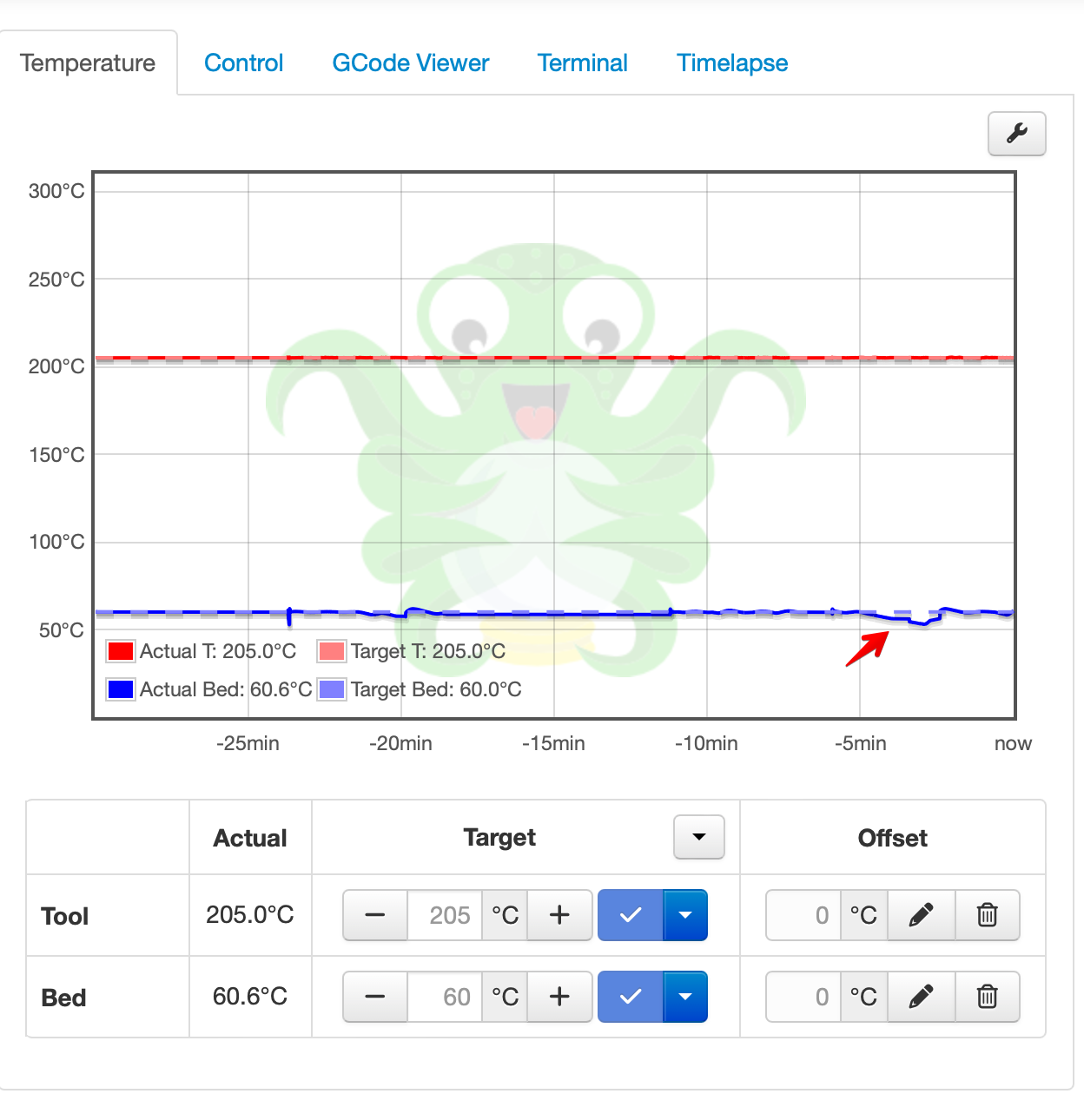 The issue has started occur recently. During a printing after about an hour of printing the hotbed temperature drops for about 10 degrees without obvious to me reason and then it reports on the screen that Temp. abnorm. after that printer freezes. Sometimes if temperature drop continues for a short period of time (less than a minute) it gets back to the normal. See temperature graph from octoprint
