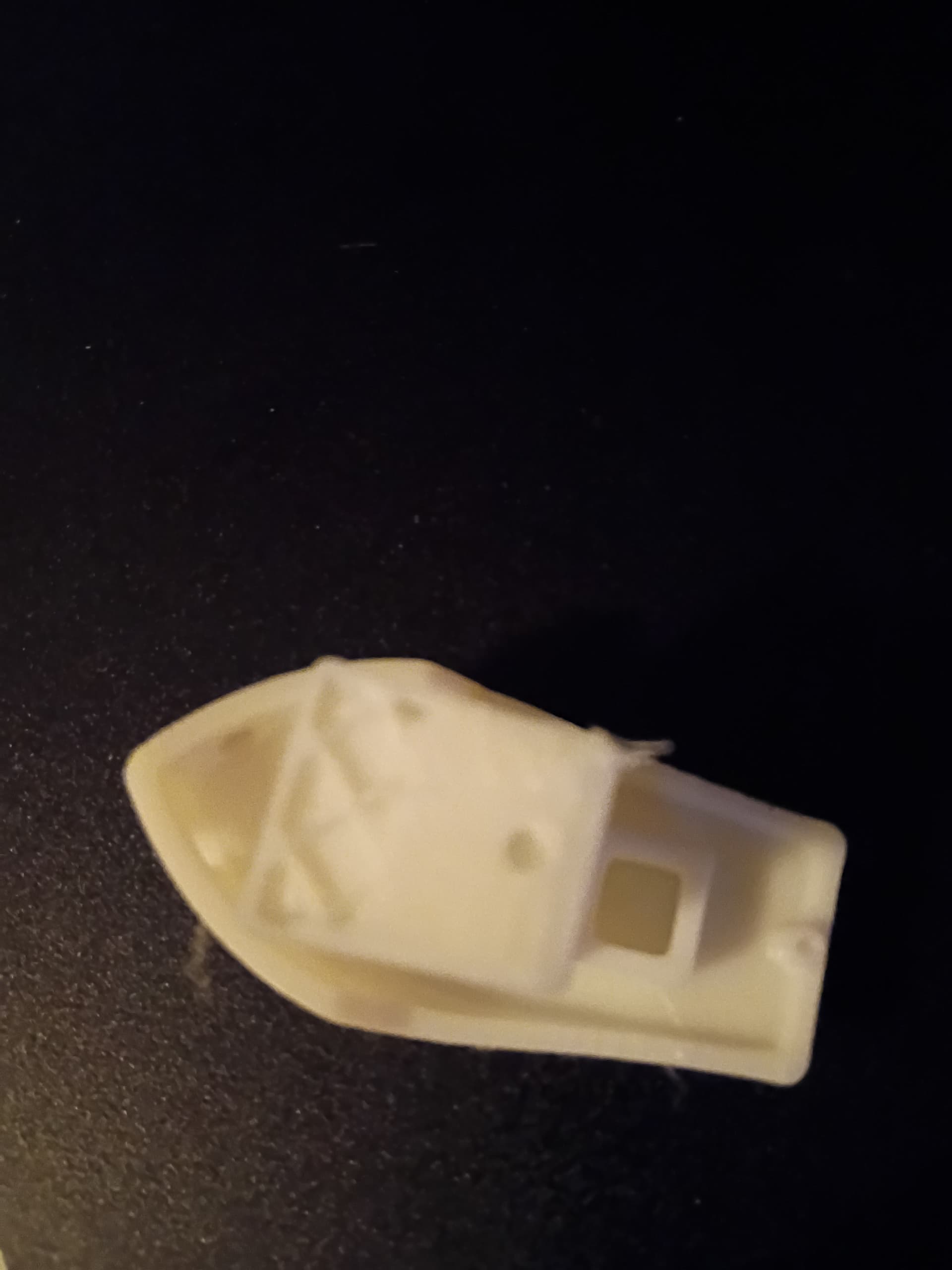 Thanks to several people, I finally got the leveling issues all figured out, but now I ran into an issue while printing. I started printing the benchy test boat, and, around 90% finished, it came loose off the bed and then slide off onto the floor. This is how it ended up.