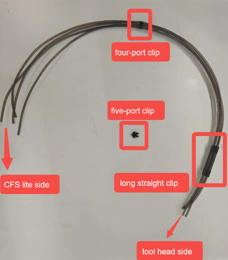 Connect the PTFE tube bundle. Install the end with the 4-Port Hub (Long) onto the Toolhead Manifold, and connect the other end to the four channels on the top of the CFS Lite.