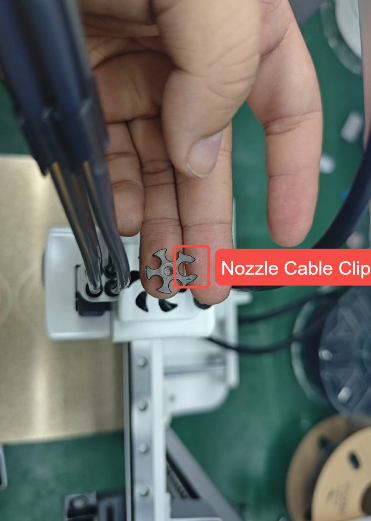 Install the 5-Port Hub. Observe the hub and orient it so that the longer clip faces backward. Install PTFE tubes into the other four ports, and secure the toolhead cable into the longer clip.