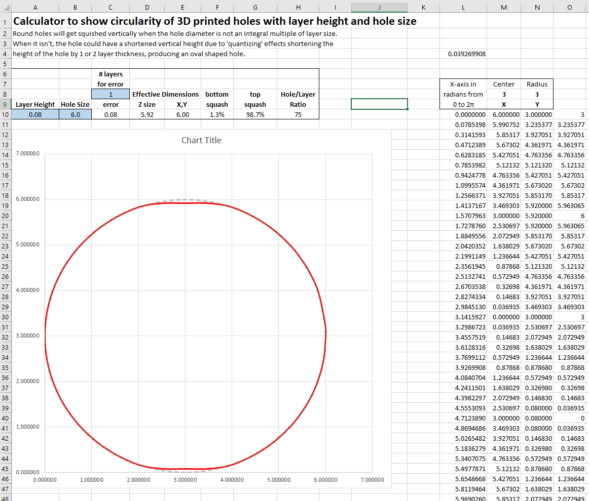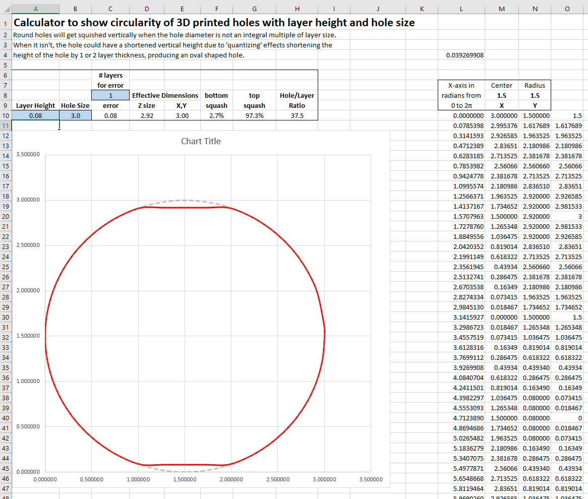 I’m not claiming that my spreadsheet is totally accurate, but it showed me that if you want to keep the “squashing” of small diameter holes on the XZ and YZ planes under 2%, the hole diameter to layer height ratio would need to be greater than 50:1. If your doing 3mm holes with 0.2mm layers the ratio is only 15:1 and the squashing would be about 7%.
