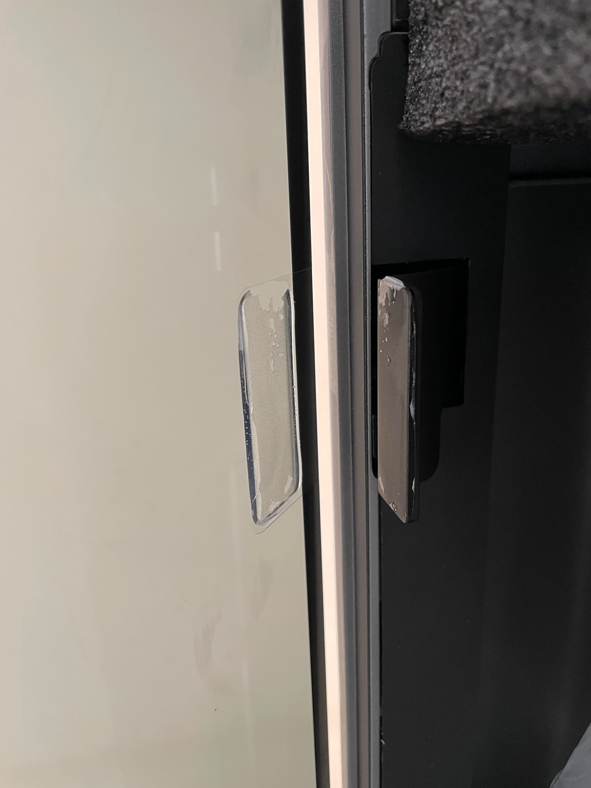 The glass needs to be cleaned, and all glue residue needs to be cleaned from both the glass and/or hinges.