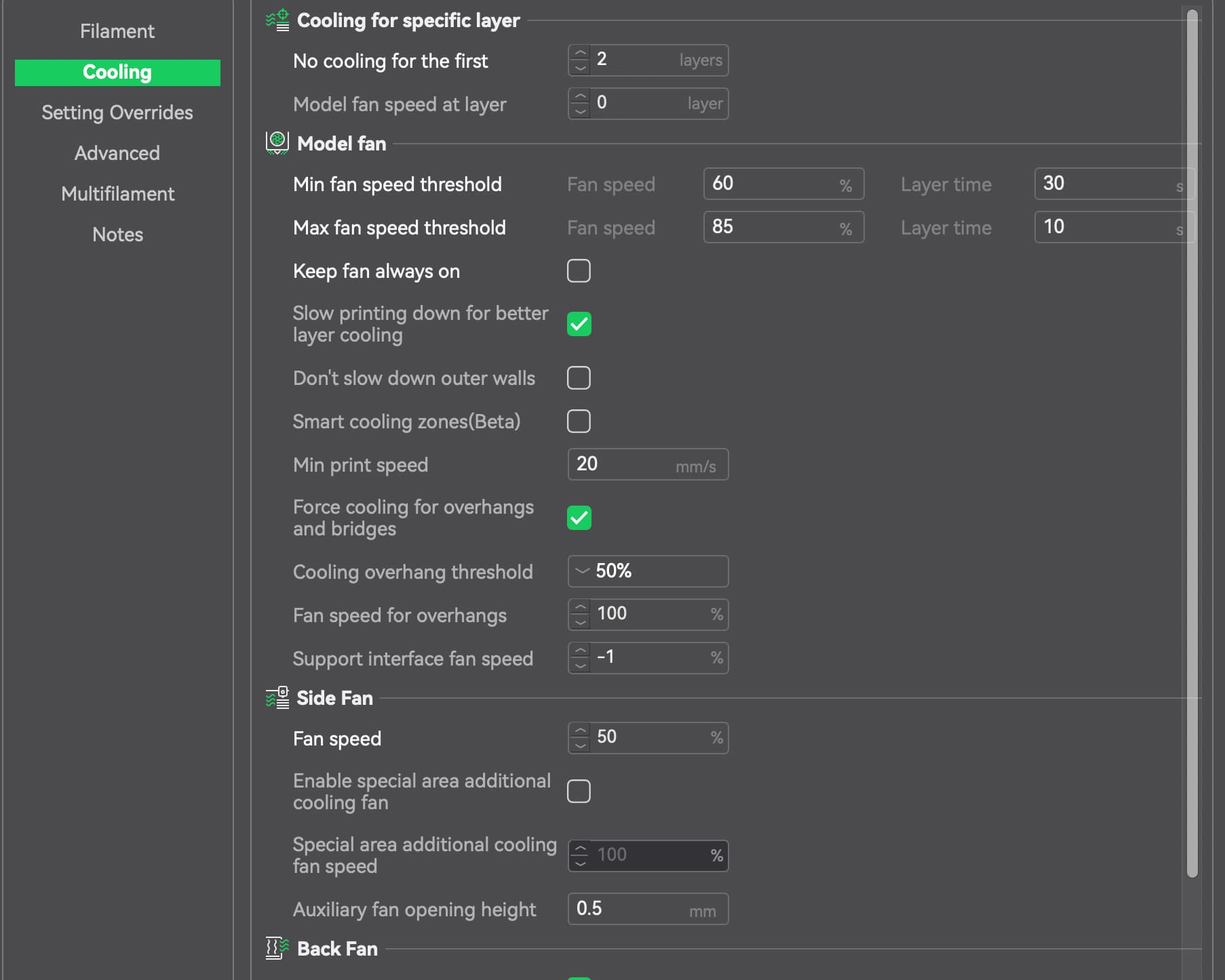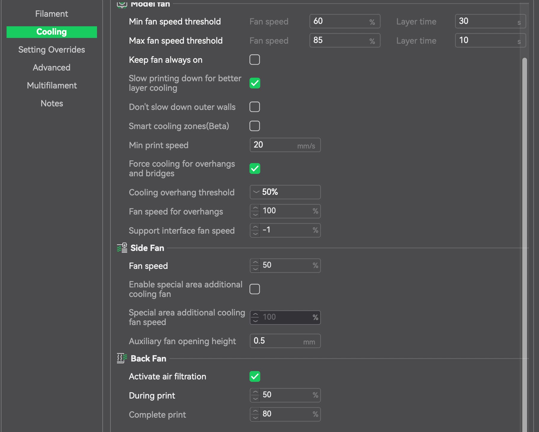 Cooling (Overture PLA):