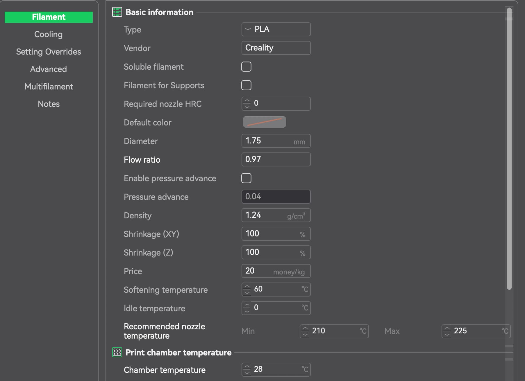 Overture PLA settings in Creality Print software: