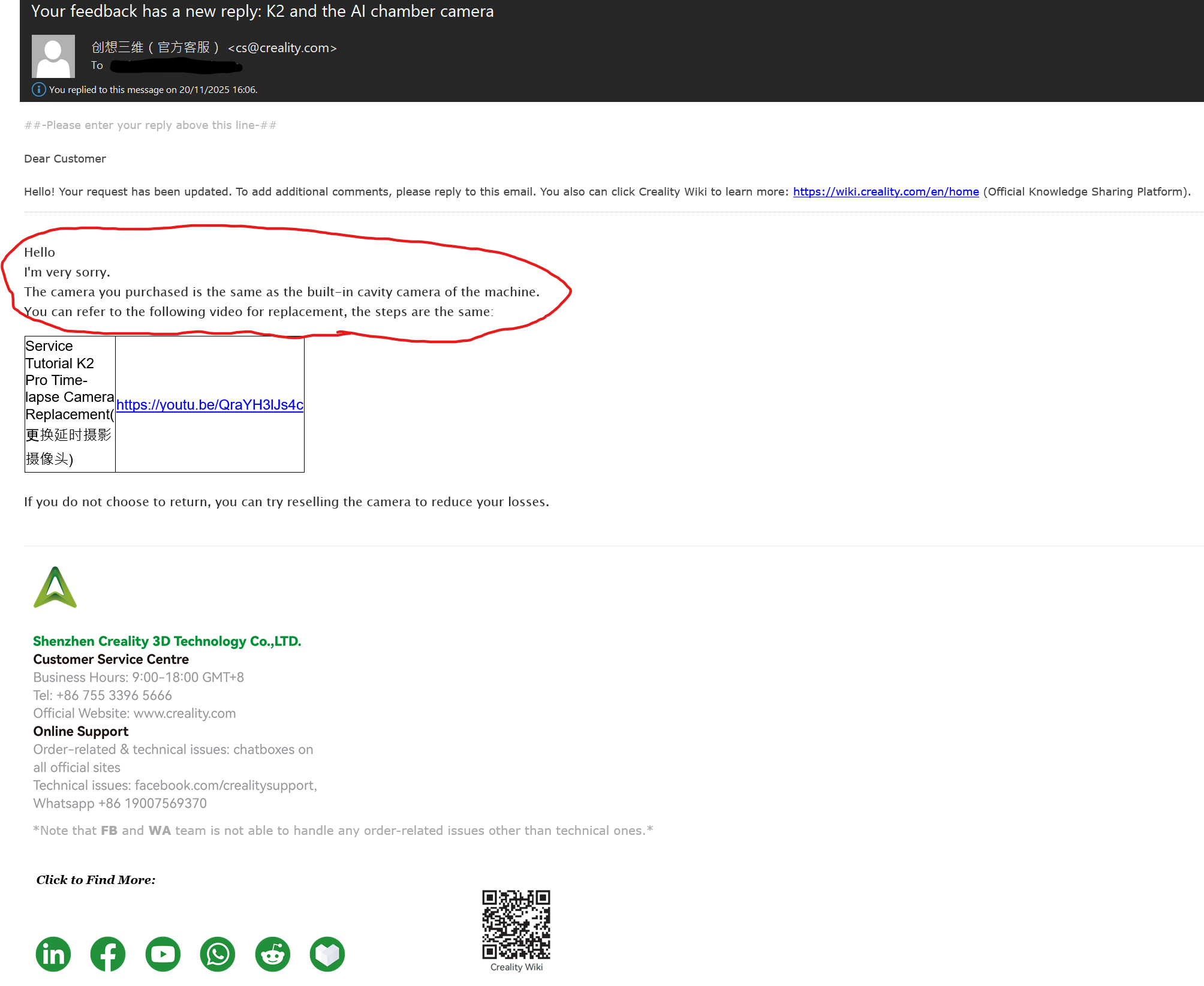 I did contact Creality via the online chat to explain this situation and request a return and refund, the response was it needs to be sorted via email and they gave me a ticket number and that was it. I have not received an email as of yet, So I doubt it go anywhere with them.