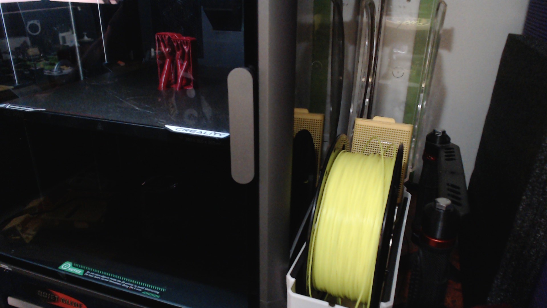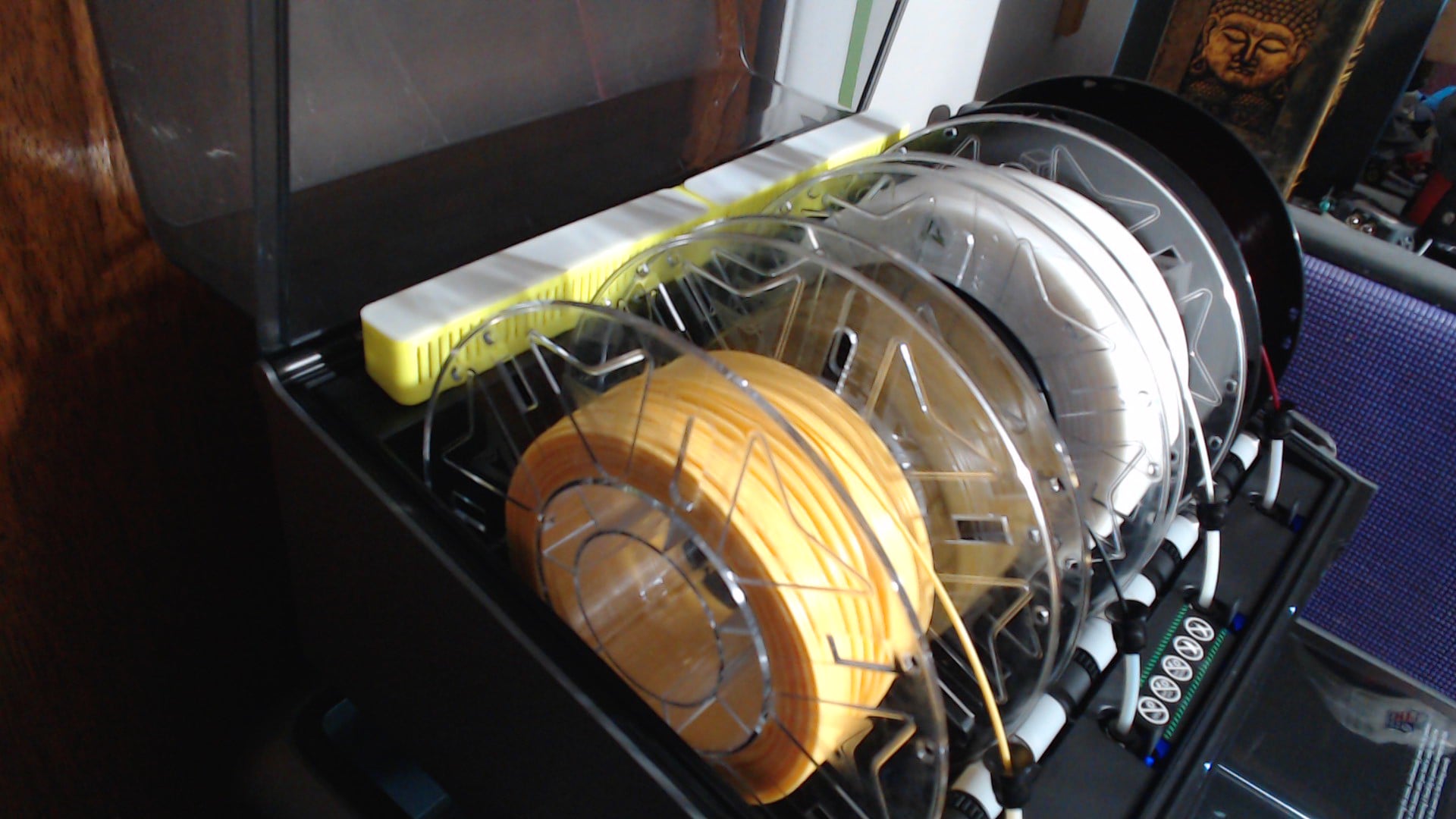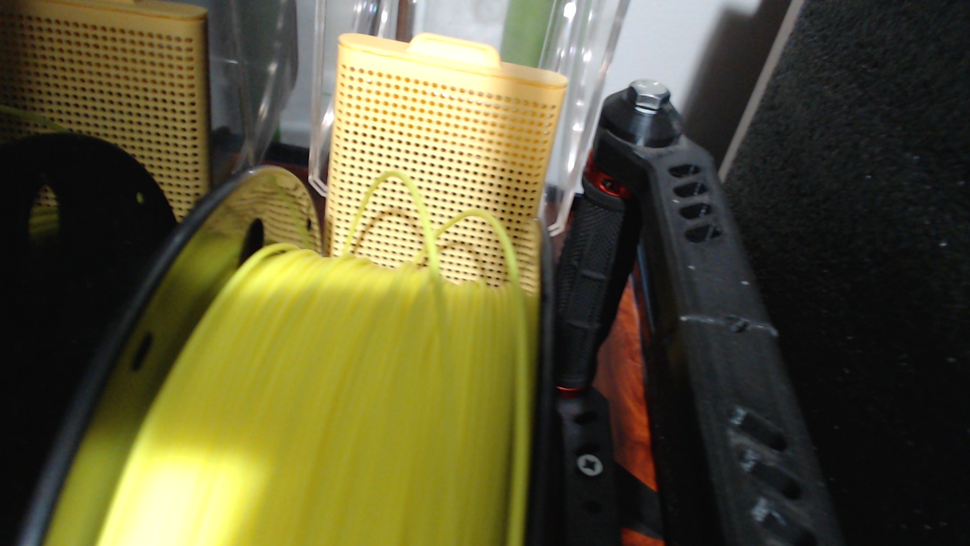 I found a piece of filament in the CFS little window on the bottom. , I printed the Desiccant holder for the Back of the Unit and the trays for the little beads. I ordered a jug on Amazon. I also have two S1 Sunlu dryers I printed the Perforated containers for those too. Now my numbers after about 40 minutes may be in the teens 17% RH and 28/30 C printing like a champ. I would recommend everyone print the thing and add it, those tray inserts and screen tops make changing it a no-fuss situation. Creality should have made it have a dryer mode.. I want to see some Dryer mode Hacks for the CFS would be Great! that is the only short comming of this system IMO. , I’m using a splitter for the external Spool and a Sunlu S1 dryer feeding it. 5 Flavors on TAP ready to GO.