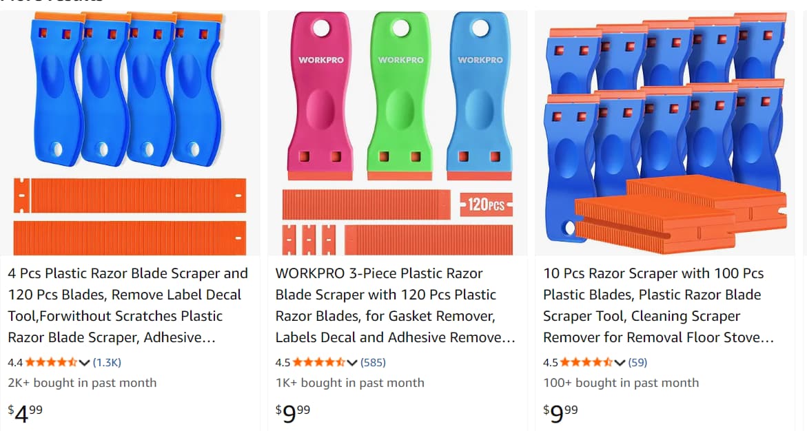 Three years ago I switched to plastic razor blade scrapers. There are hundreds of sellers, and the cost works out to roughly $0.05-$0.10 per blade. They only sell them in boxes of 20-100 so if you spend more than $10, you should be double checking your cart for a mistake. For cleaning build plates, they outperform every printed scraper I have tried, including designs that use metal blades. The blades are made from a slippery nylon-like material that holds an edge without scratching the build surface, and when they dull, you simply discard them.