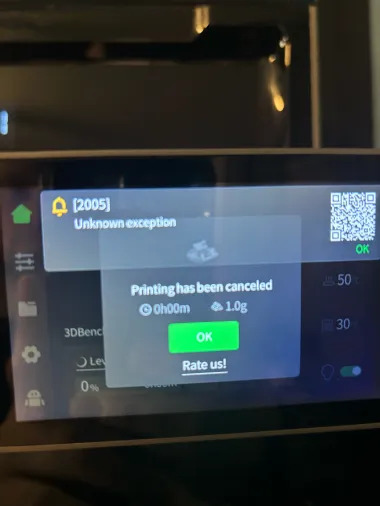 Hello everyone I need some help. I’m new to the 3d printer community. Recently purchased my K2 about a week ago. Set up everything up and it work like champ. My last print I stepped away for a bit then came back to the blob of death. I replace the block with no problem. Turned it back on to get it running again keep getting an error 2076. Couldn’t find anything about the code online. Decided to do a factor reset to see if that would solve my issue. So I recalibrated the machine and try to run a test print with a boat. Now I’m getting another code 2005. Please can any help with suggestions or lead me in the right direction. Please and thank you.