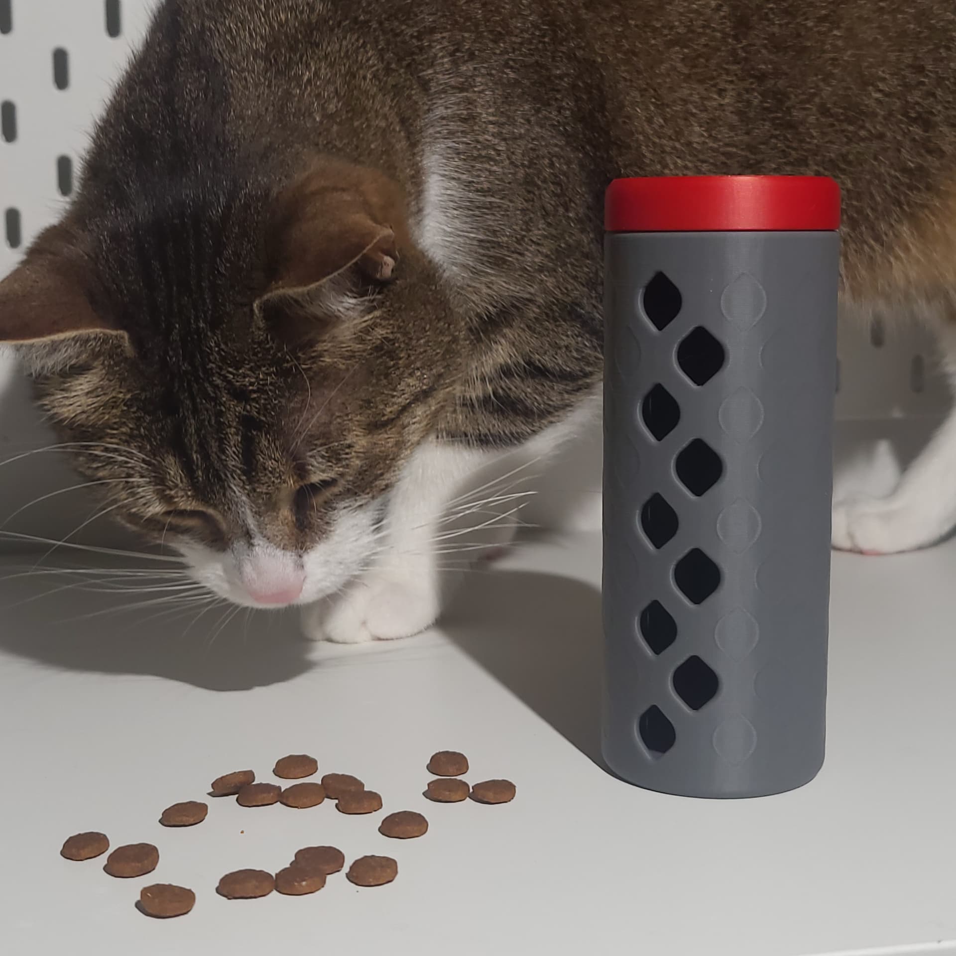 I designed this interactive toy for cats that dispenses treats when rolled. My cats are really enjoying it!