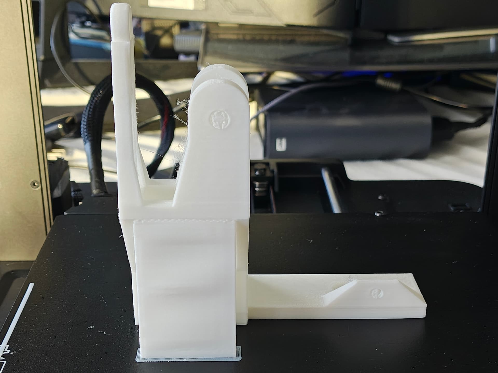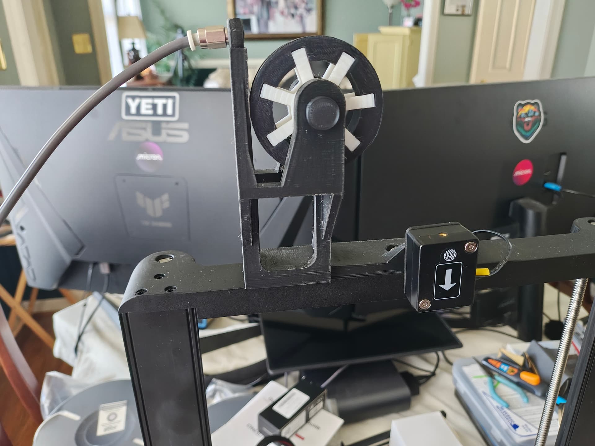 I also printed out a filament guide so I can print directly from my dryer. My first one broke because somehow when printing the filament got itself tangled and started picking up the dryer and snapped off the filament guide post. Opps. It was right in the middle of printing the monk. I thank Creality for the filament sensor as the monk was about 2/3rds done when this happened. This is the first version. The arm on the left is what broke. I then put the file in Tinkercad and beefed it up. I reprinted it in black (color I wanted it in anyway, my black was still in the dryer). Second one turned out fine.