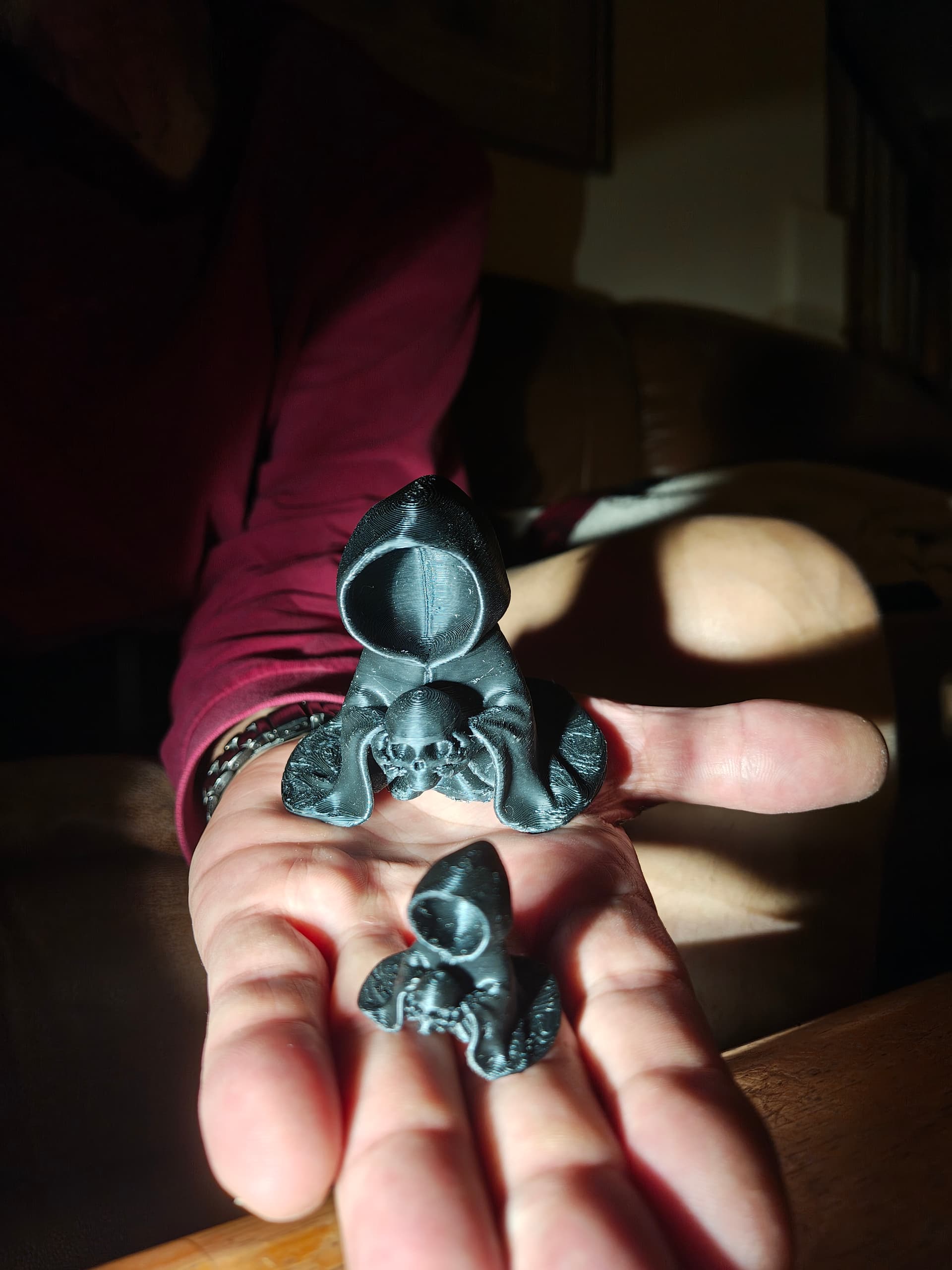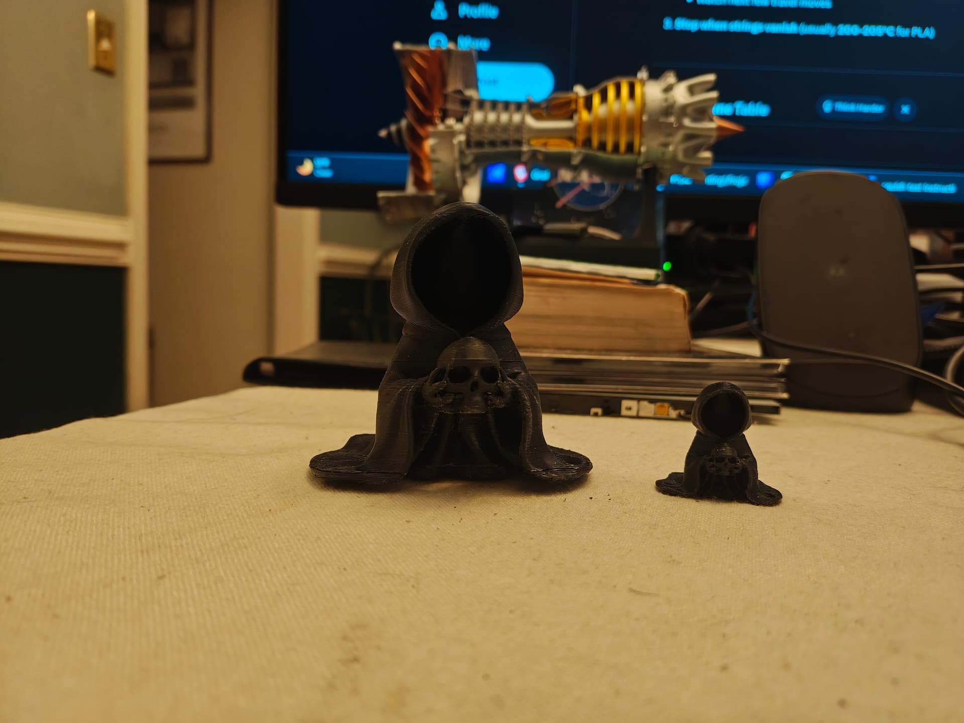 Printed this friendly monk. The little one I printed a few day ago before my adhesion issues. I tried to print him bigger but it kept failing. Today was a success: