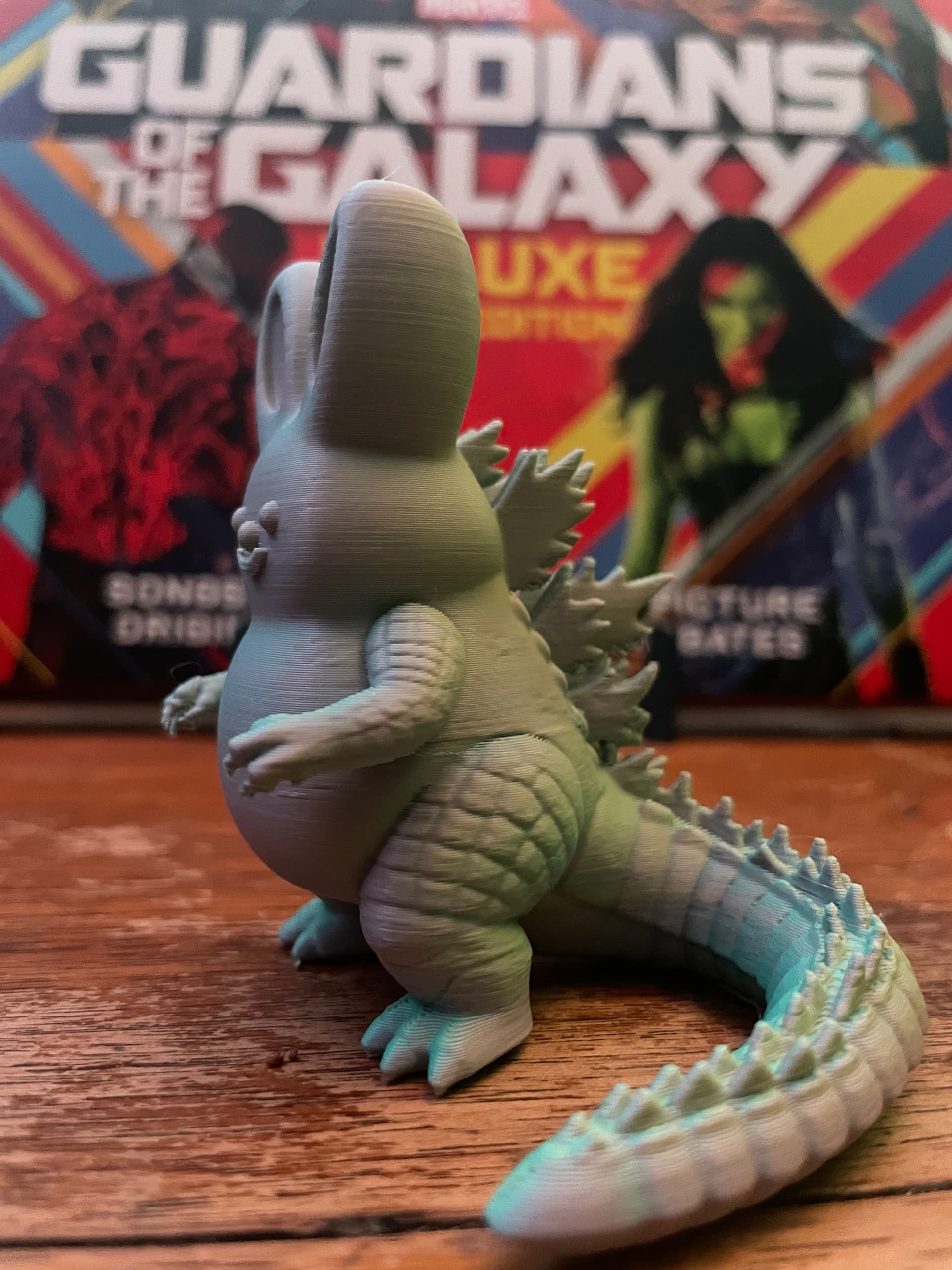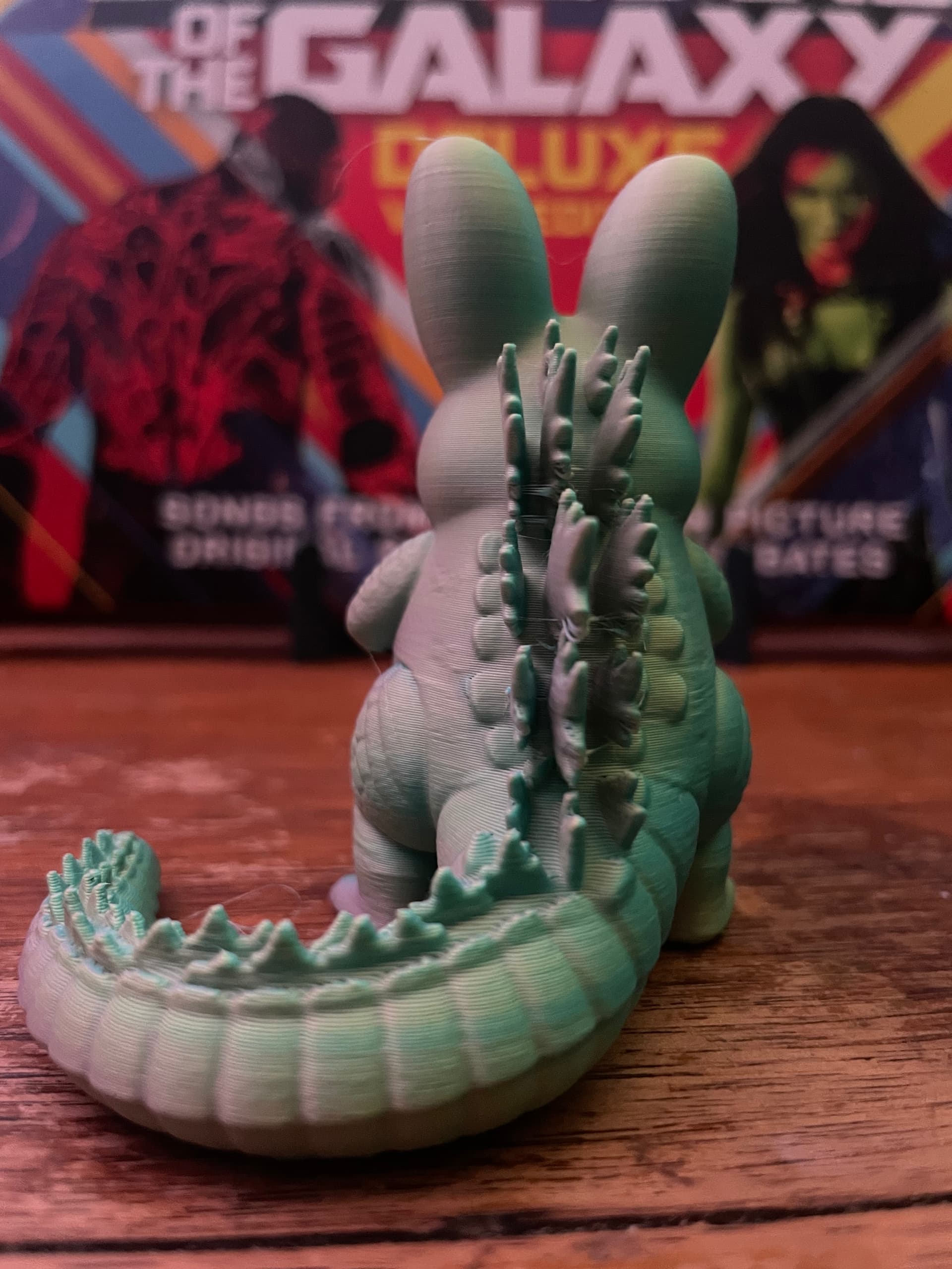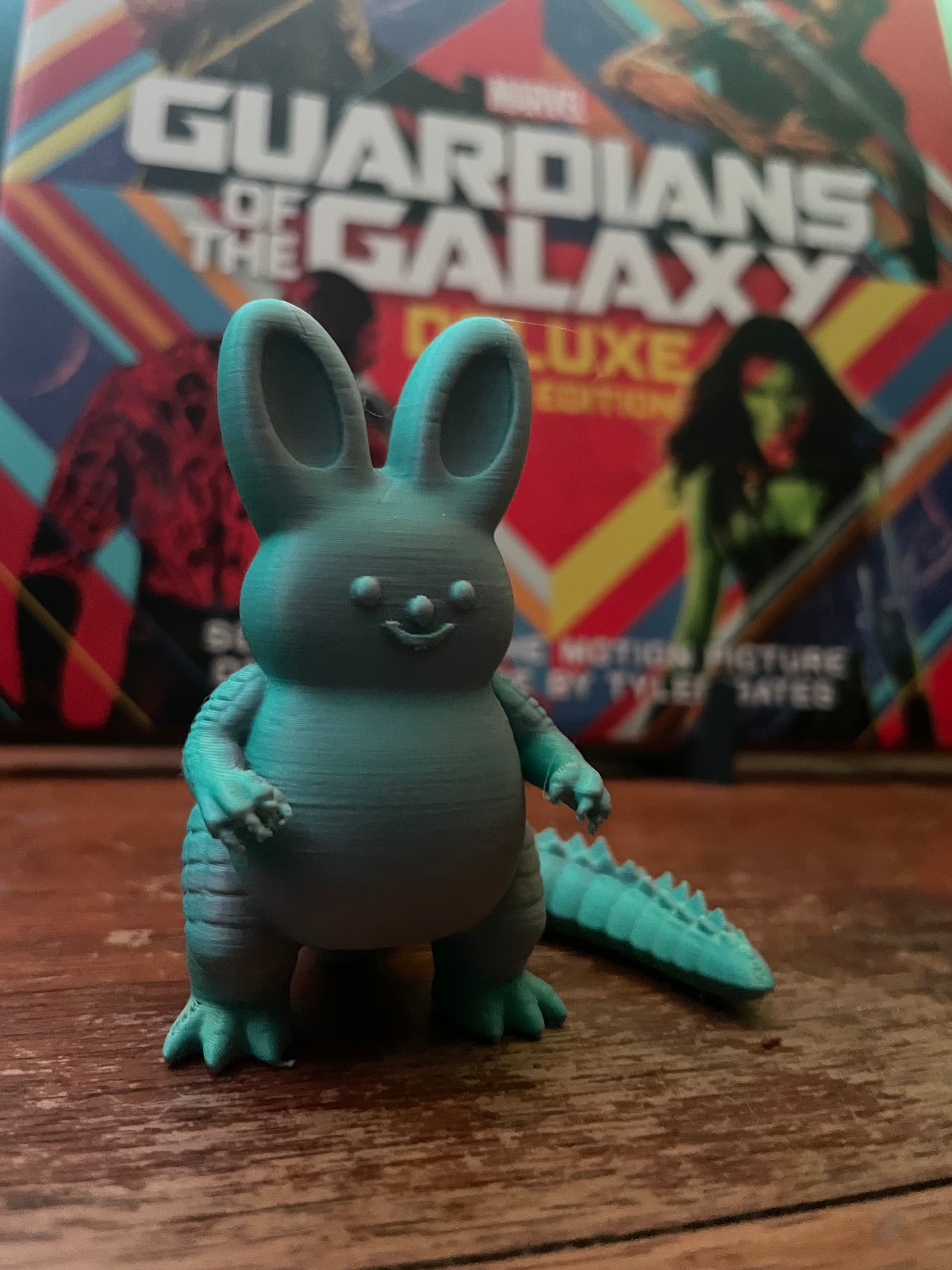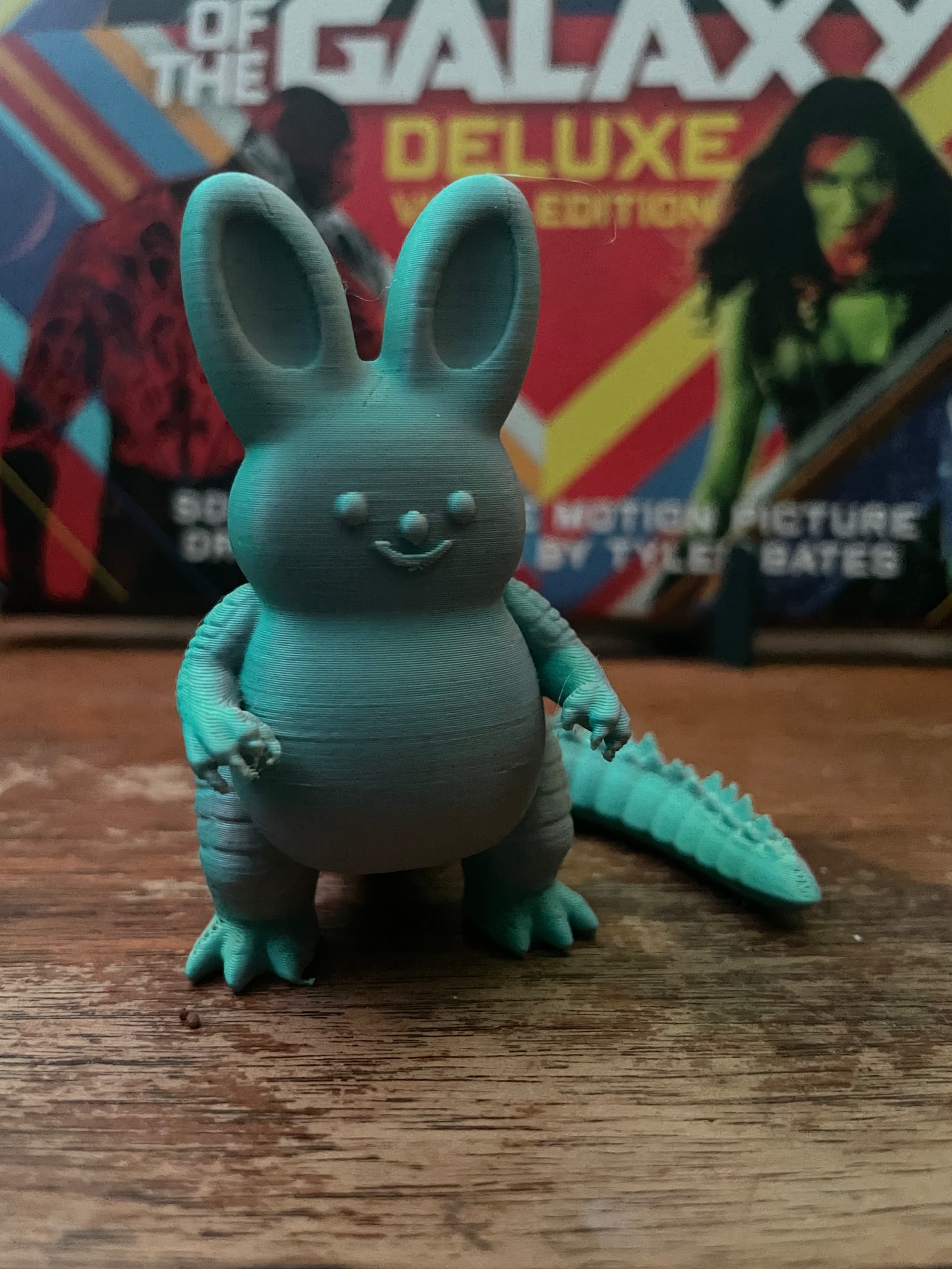 A bright, whimsical creature with a dash of reptilian attitude and bunny‑cute charm.This hybrid critter features a rounded, chonky body, expressive ears, and a long textured lizard tail—designed to stand out as both a fun display piece and a great test of color‑contrast filament work.