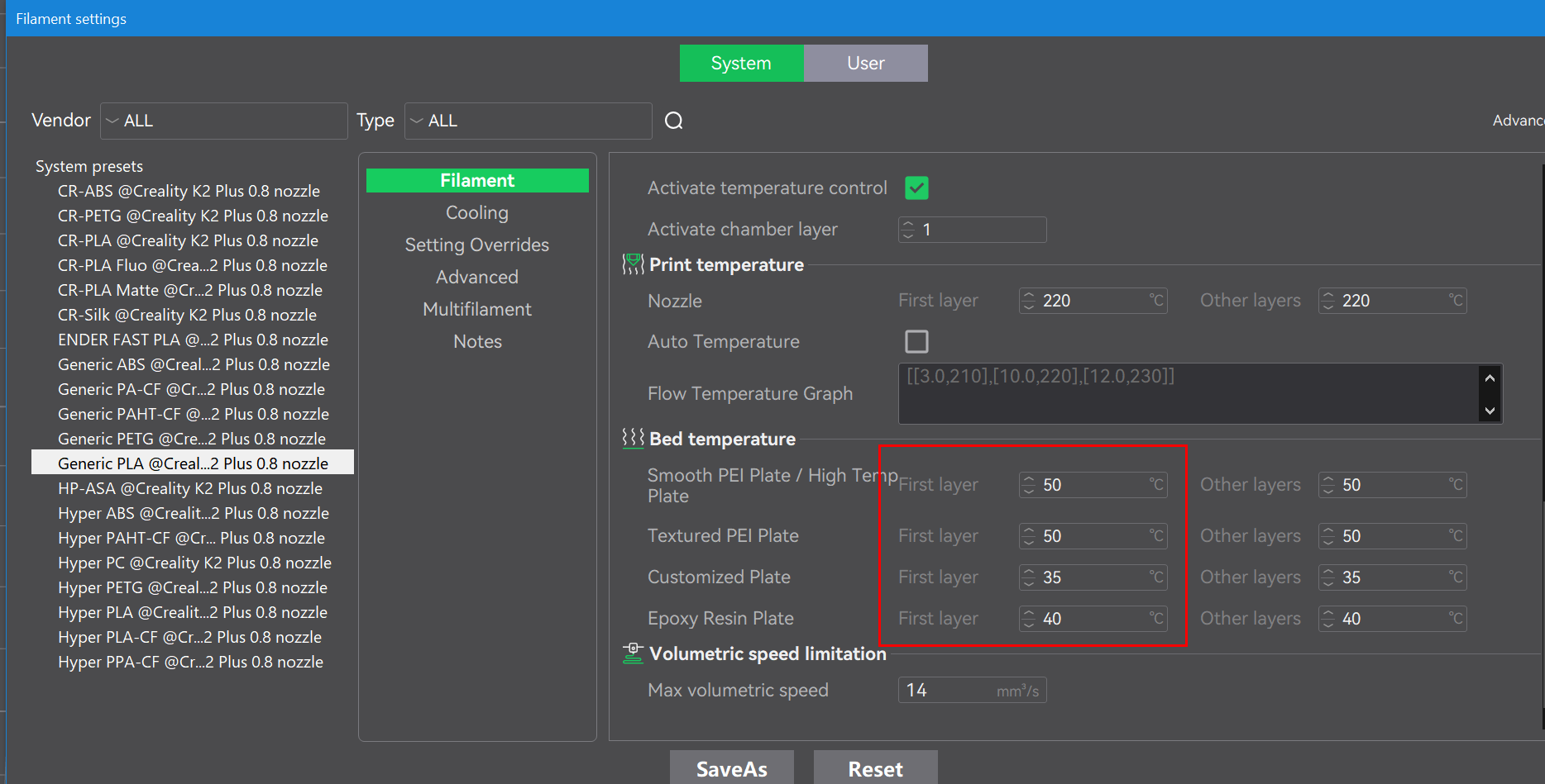 Filament temps - If you’re filament temp is two low for the first layer, it may cause the print to not stick at the start. This can and will lead to the model becoming unstuck during print leaving you with either a big blob under the nozzle or a pile of spaghetti. Fix this by going into the filament profile and increasing the filament temp for the first layer.