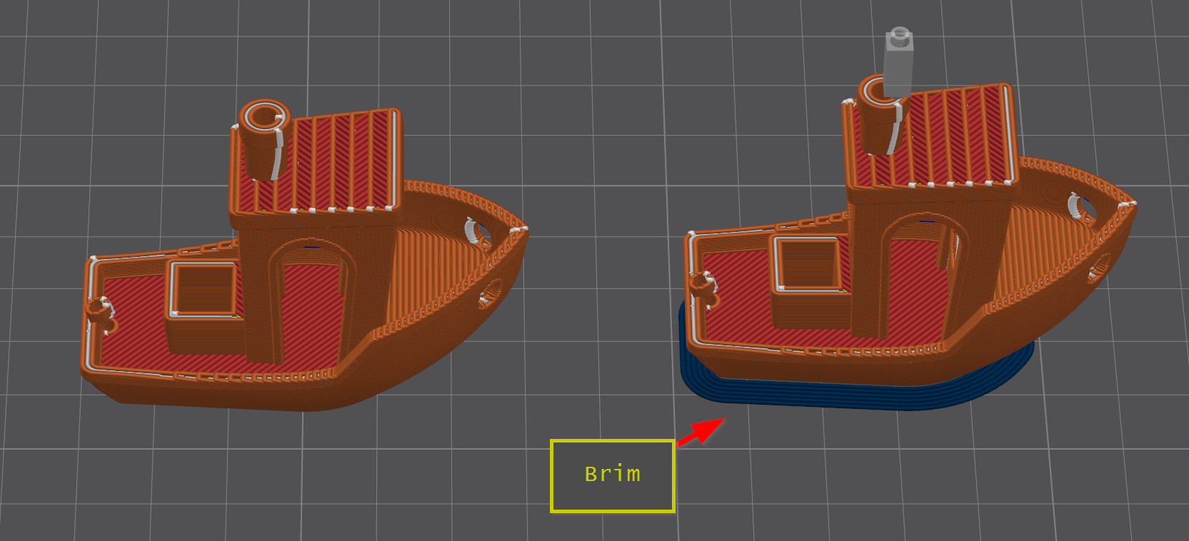 Brims are easy to enable and add a single-layer perimeter around the base of the model to increase adhesion. This option can be found in the print settings.