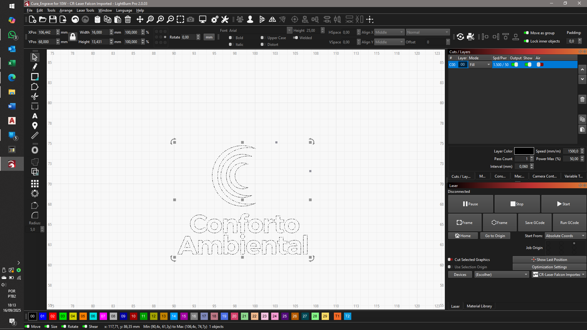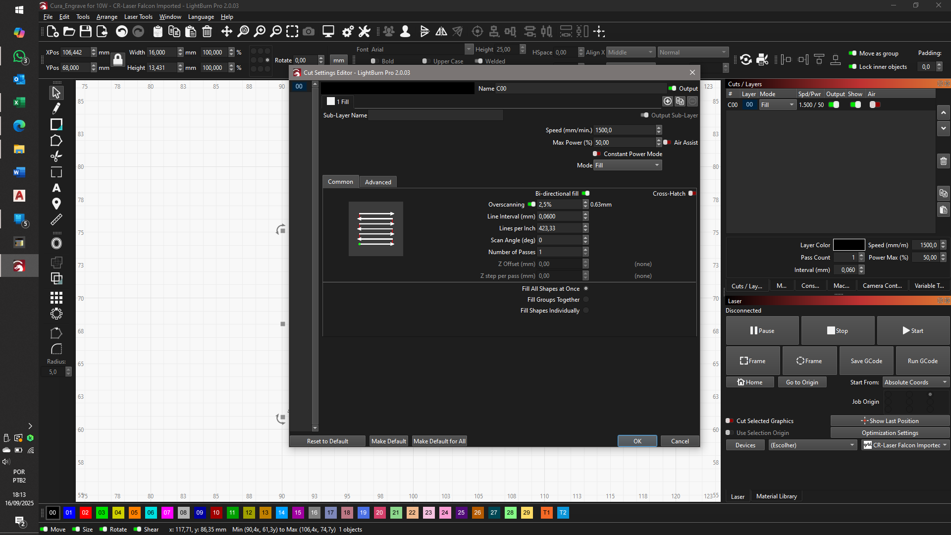 In the photo 1 the image I´m trying to create is 16mm wide by ±10mm high (photo 4), and the settings are these (photo 5), I´m trying to engrave in painted aluminum but I think it doesn´t really matter right now. I also tried to convert to bitmap and different sizes in both formats and different speeds and lines per inch (not sure if it is the right therm).Am I doing something wrong or is just something broken?