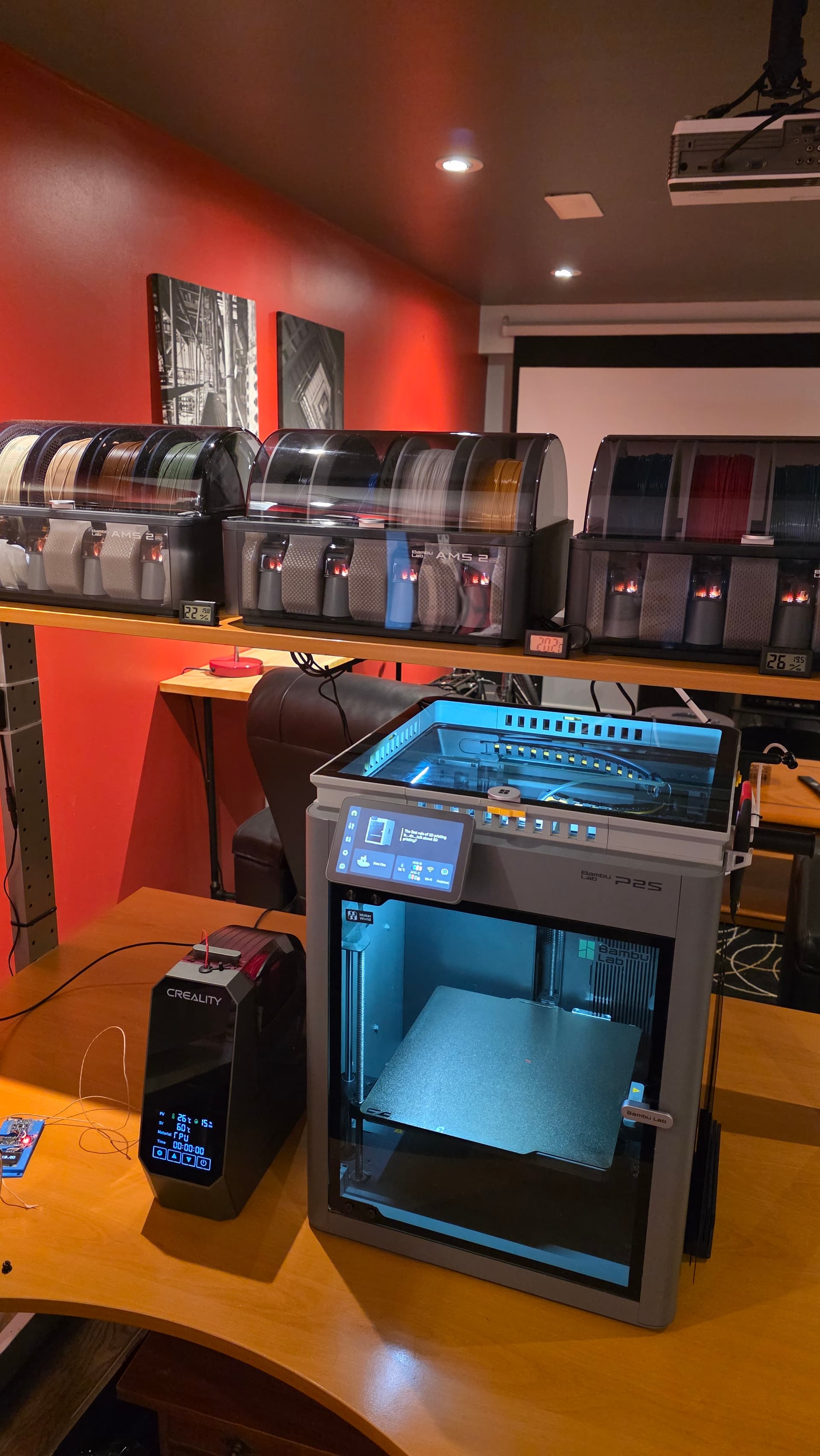 Here is my Bambu setup. The shelf above holds three AMS units with only a couple of inches to spare, so I cannot put the dryer up there. I could make a raised platform beside the printer, which I might do.
