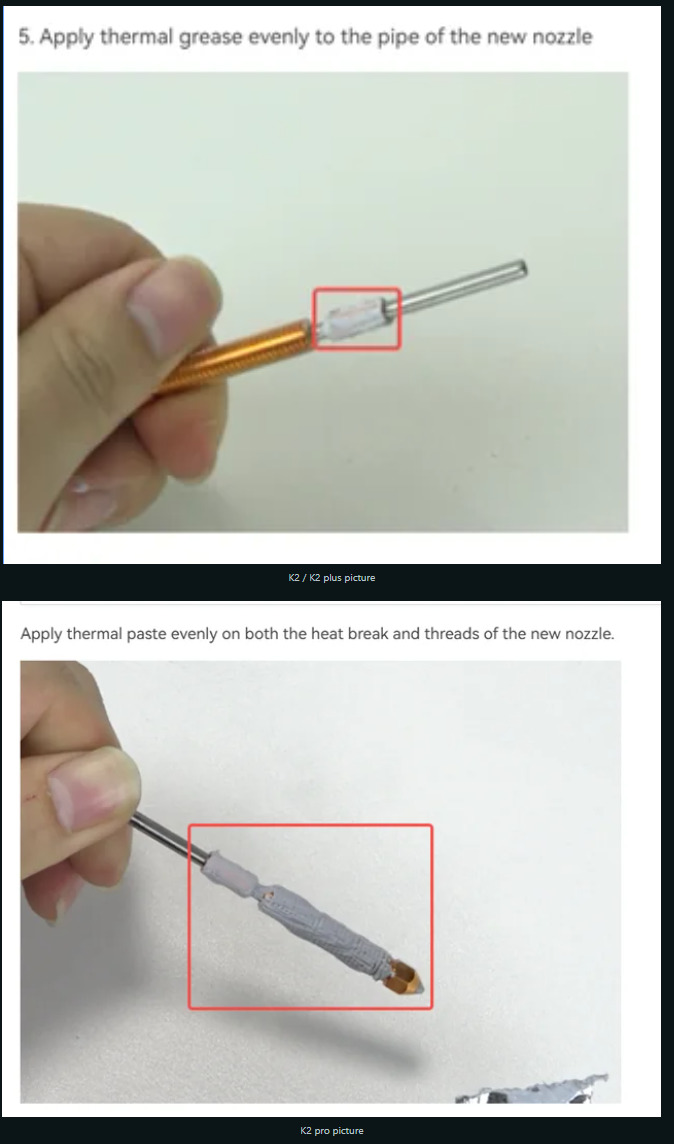 - When I swap nozzle there is some miscommunication in wiki guide, K2 plus and K2 standard show process of putting thermal grease only on clynder part and nowhere else, while K2 pro shows absurd amount of thermal paste troughout whole nozzle,