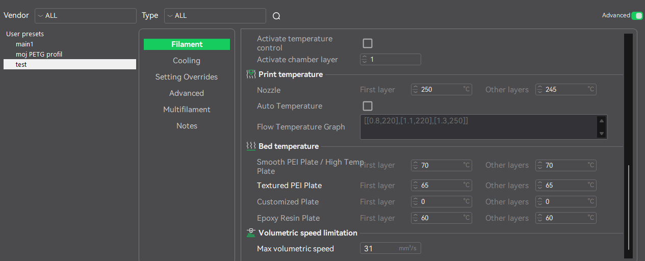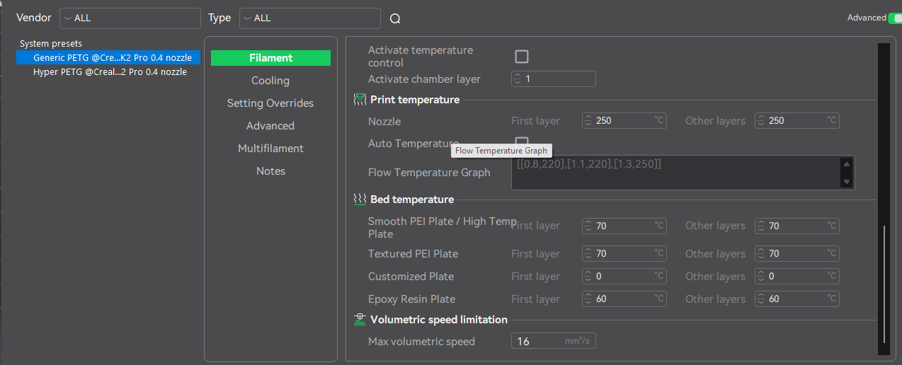 But no matter what setting i choose on k2 pro, fluidd ALWAYS shows max volumetric flow 23 or 16 based on what CFS has picked. There is no option other than Creality / Generic PETG, and based on what I see, printer uses System preset volumetric flow and not user preset one.