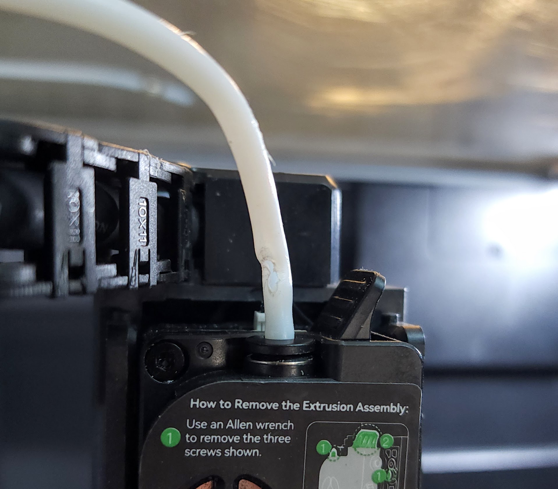 Ever with the strain relief in place It looks like the Bowden tube is getting heat and friction damage. Note how the tube bows in just above the attach point. Also curious that the hole is on the inside of the curve, as if it was actually caused by the strain relief plus heat.