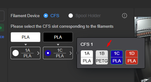If I slice it and try to send to the printer it has PETG with no colour and all hatched out. It absolutely refuses to even transfer the file to the printer saying it is not mapped or some such crap. All the other filaments loaded work fine but the PETG-CF will not. Send to and then print from the printers screen, still refuses to print from the CFS. It is an RFID tag that CAME ON THE Creality SPOOL!!