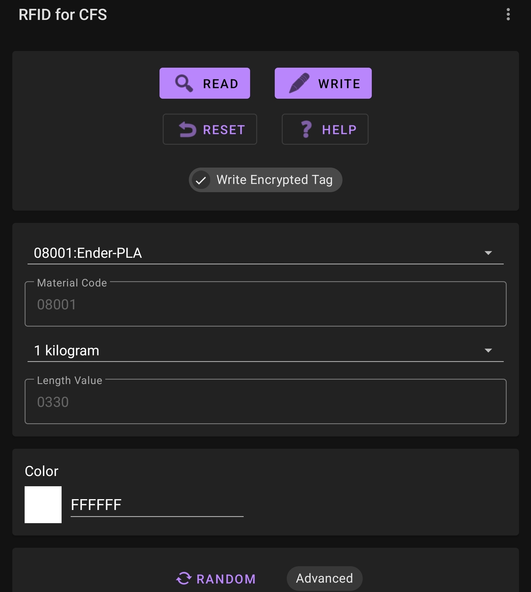 Once I get a spool with the rfid in it, I will scan it and see what info is on it and which protocol it is using. I should be able to replicate it as long as it is an industry standard. Fingers crossed. It would be nice to be able to program your own color codes and temps for each type/ color. Especially when you use other manufacturers filament.