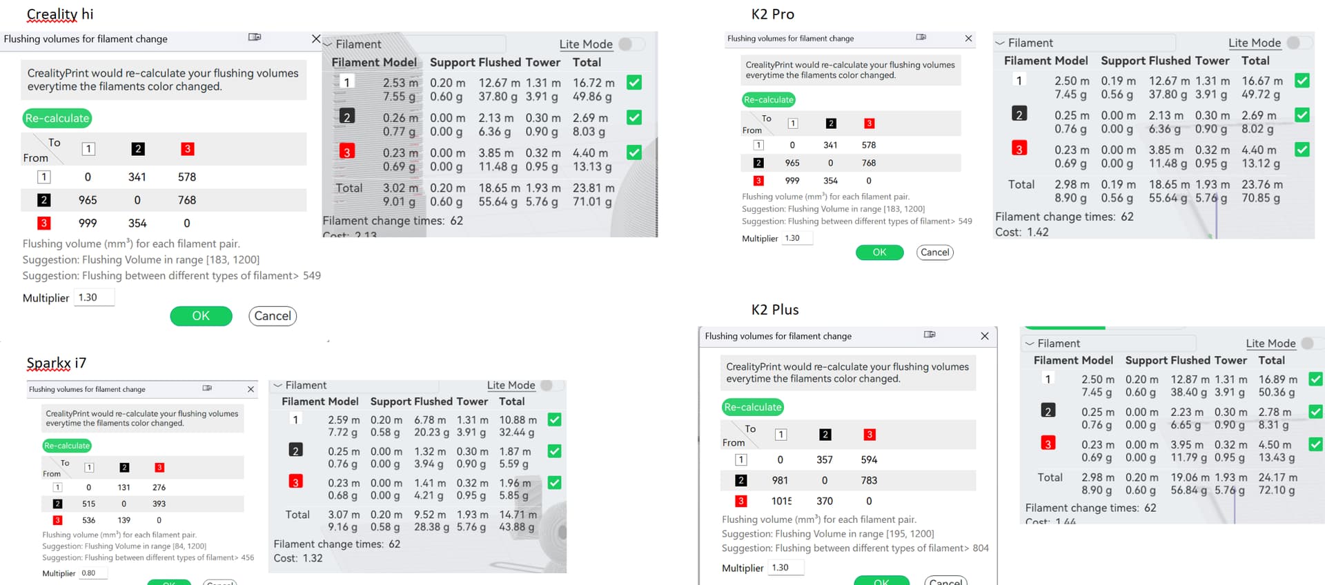Results of testing. The Sparkx i7 does indeed produce less waste when the correct Flush Volumes are used. In my test it was between 61% to 65%. Probably due to the shorter nozzle on the Sparkx i7. Note the 3 other Creality printers all have the same nozzle length.