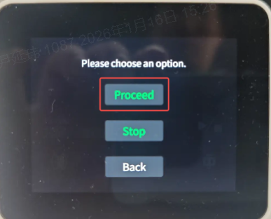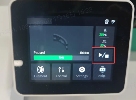 Place the prepared filament back in position and click “Continue Print” to resume the print job. Observe whether the filament is feeding properly.;If the filament extrudes normally, you can continue the print job.;If the filament still does not extrude and the printer reports a grinding or clogging error, it is recommended to replace the Hotend before continuing.
