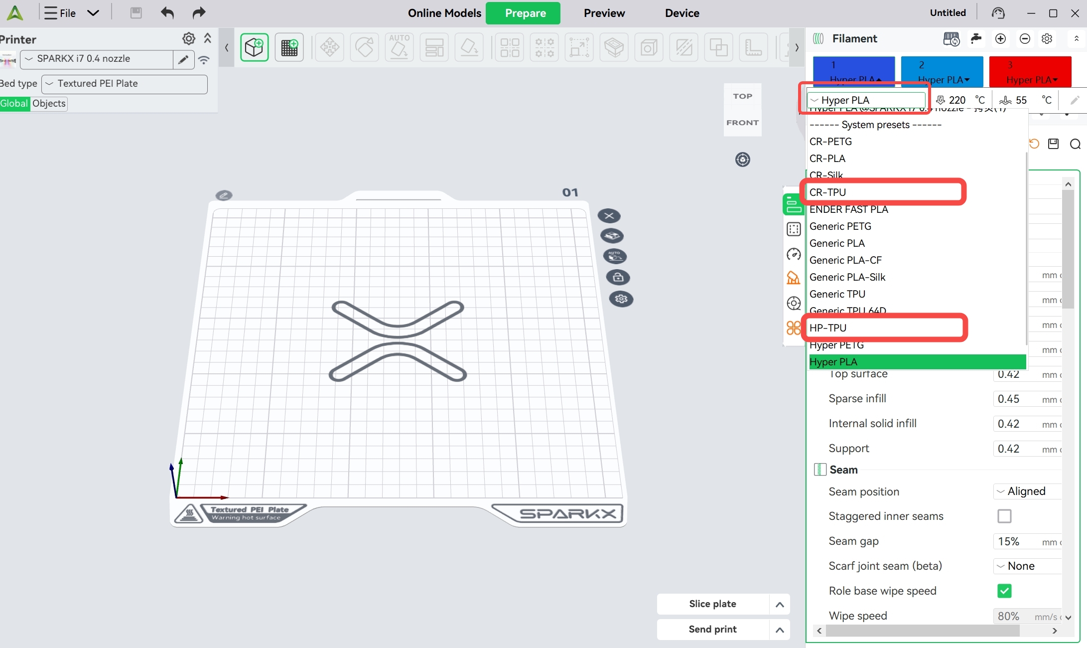When printing flexible filaments, it is recommended to use a 0.4 mm nozzle along with the corresponding preset parameters. For Creality CR-TPU and HP-TPU, dedicated filament presets are available. If you are using third-party flexible filaments, we recommend selecting the more conservative “Generic TPU” preset.