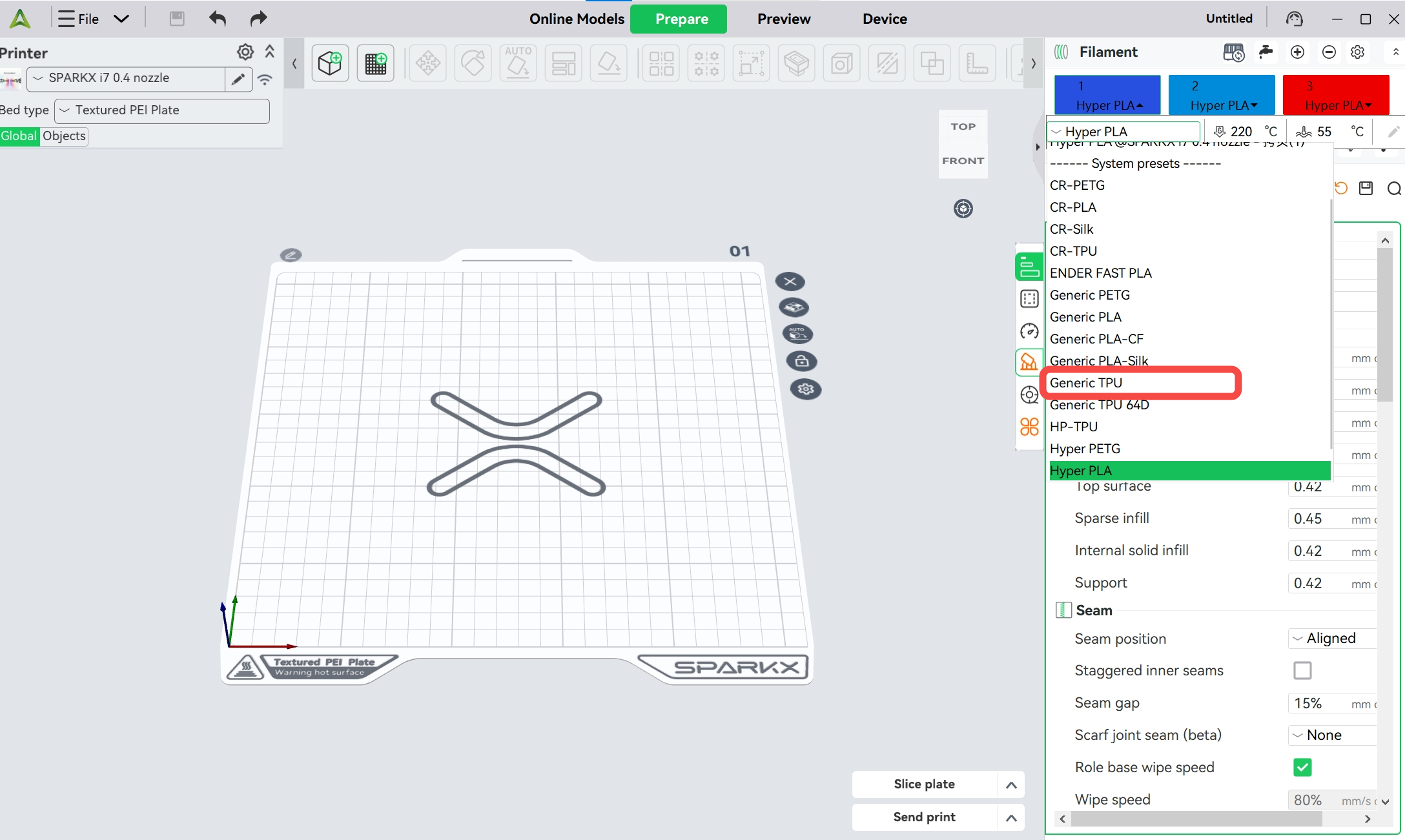 SPARKX i7 supports printing flexible filaments with a hardness of 95A or higher. If you want to print TPU filament using the CFS Lite, the filament must have a hardness of 64D or higher.