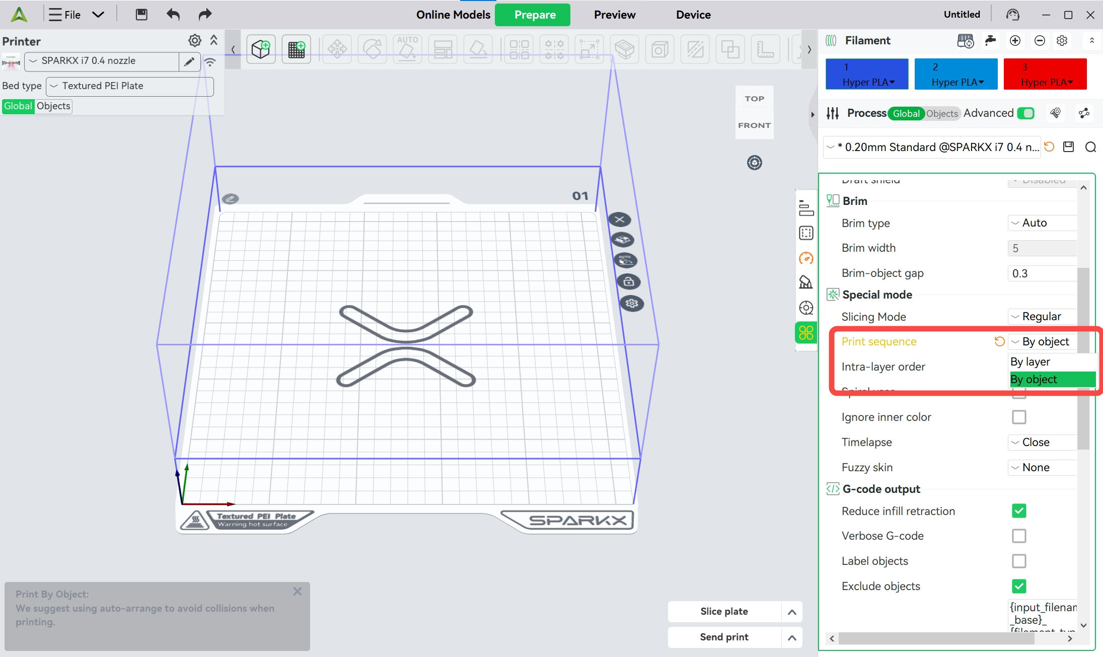 Most flexible filaments are prone to stringing. Therefore, when arranging models on the build plate, excessive travel moves should be avoided. It is recommended not to place too many models on a single plate or use layer-by-layer printing. Instead, place only one model on the plate, or place a small number of models and use print by object mode.