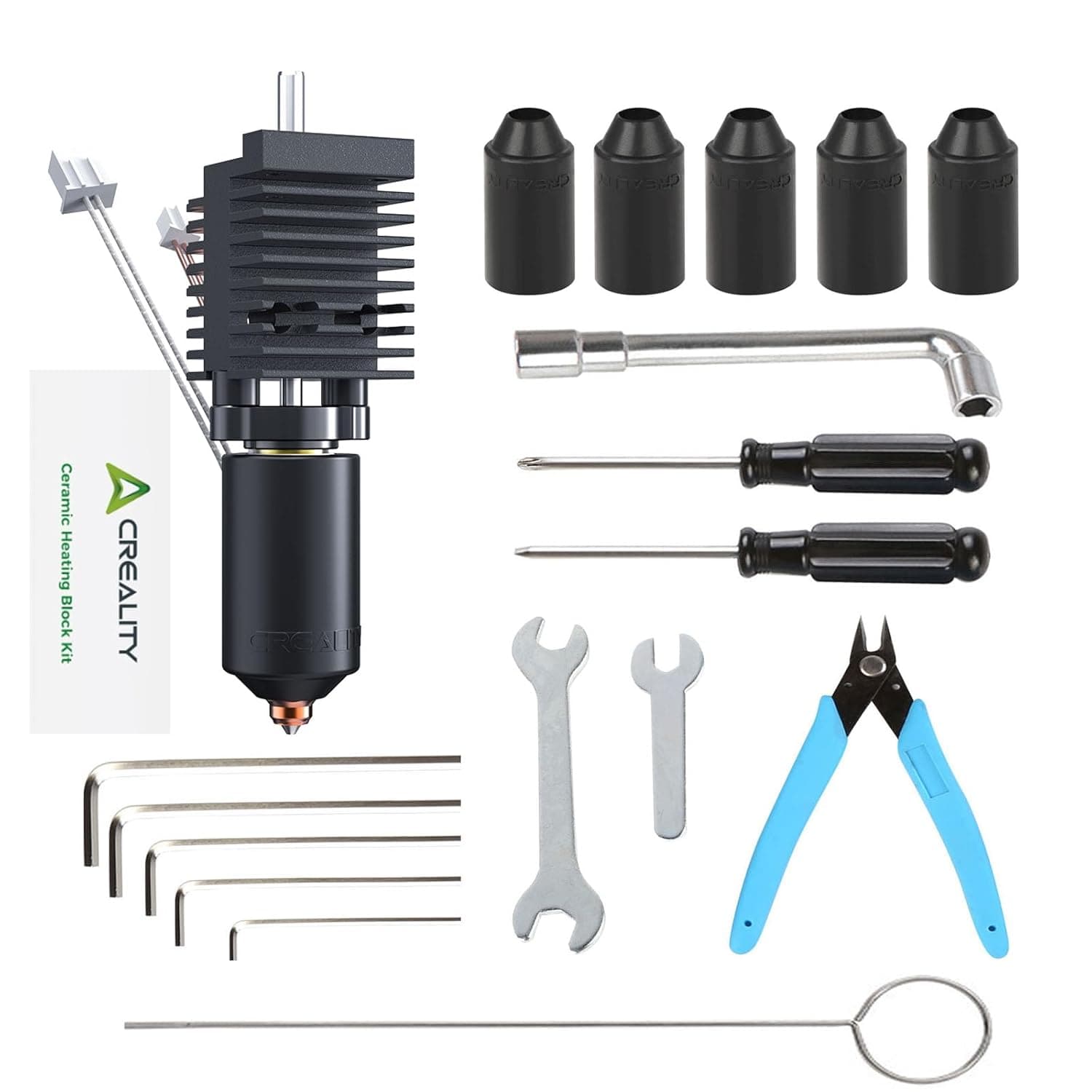 Prices range from $13 - $32 for the “Creality Branded” version which often includes extra screws and an Allen Wrench. They all come with a nozzle usually 0.4mm but if you shop, you might find other sizes. It’s only worth mentioning because your current nozzle is salvagable and can be used as a spare, so if you can find lets say a kit with another nozzle size, you’ll now have two nozzles. Note, you should not attempt to remove a cold nozzle, it must be heated. A heat gun or jet lighter can be used to heat the assembly outside the printer but take safety precautions not to burn yourself.